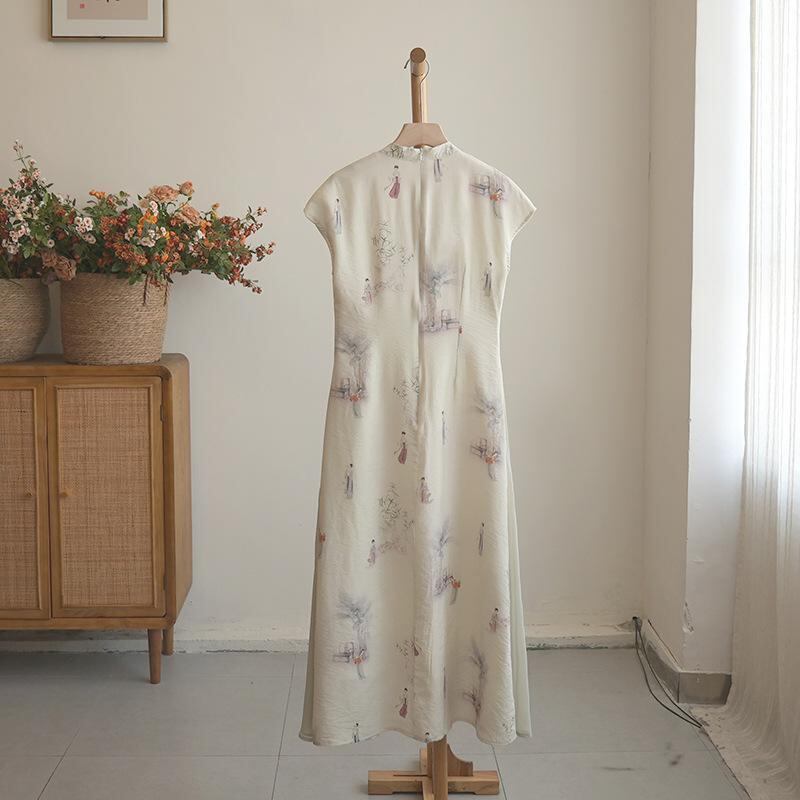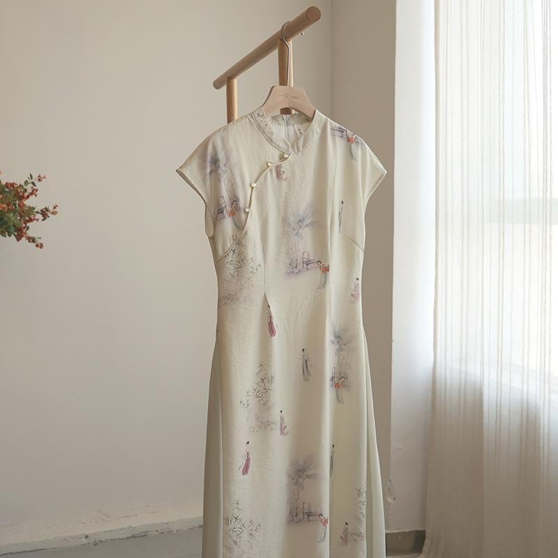 ワンピース レディース 新チャイナ風 レトロ エレガント 上品 ウエストマーク フレア ロング丈 ノースリーブ スタンドカラー リヨセル 再生繊維 アプリコット ベージュ系 夏用 体型カバー お出かけ カジュアル