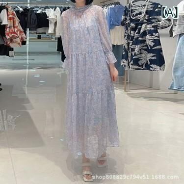ワンピース レディース 小花柄 フリル襟 七分袖 フレアスリーブ Aライン ハイウエスト ミモレ丈 ミドル丈 通勤 オフィス エレガント フェミニン 若見え きれいめ ラウンドネック ポリエステル ラベンダー パープル