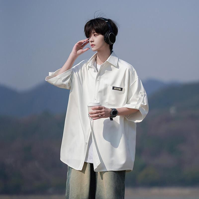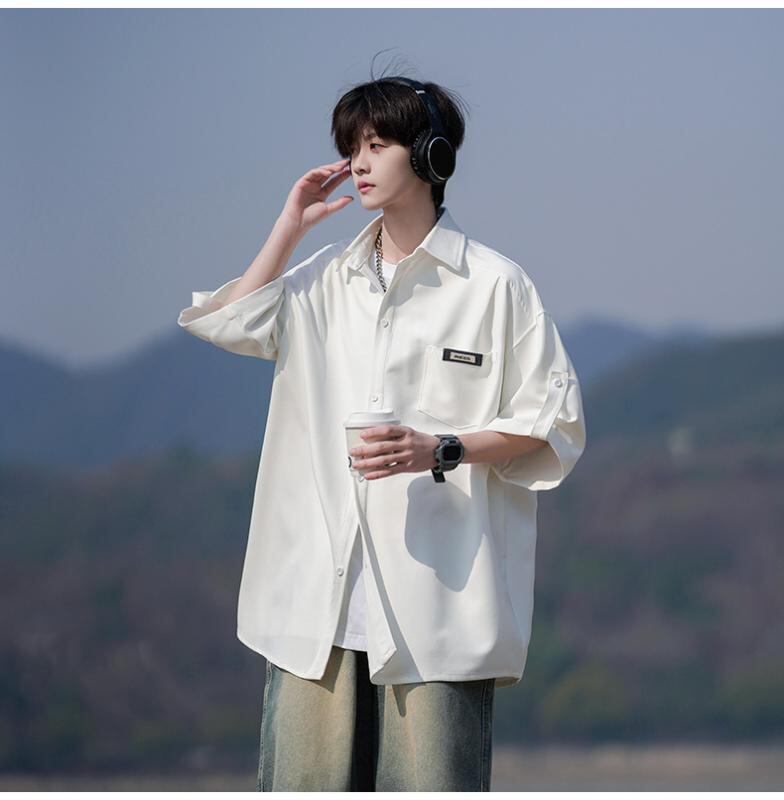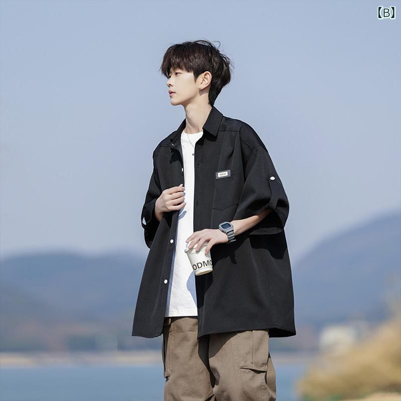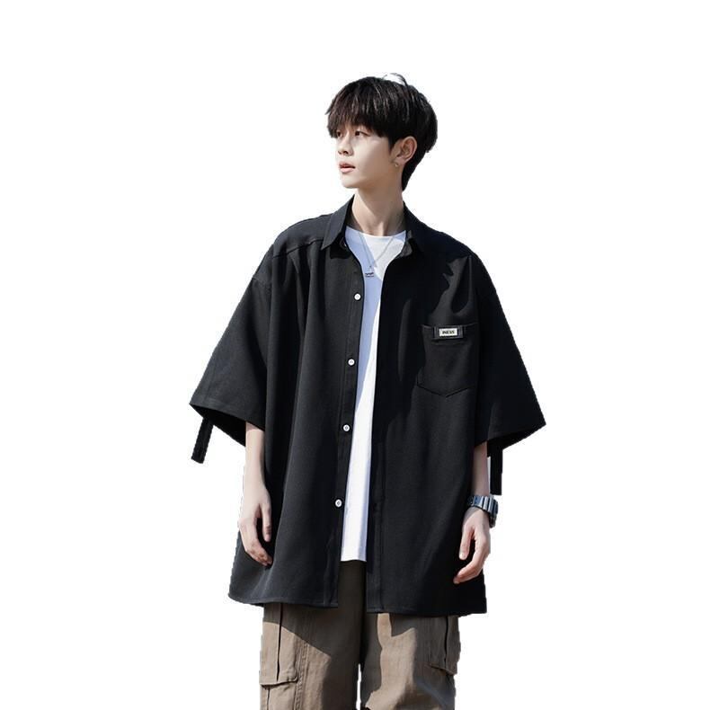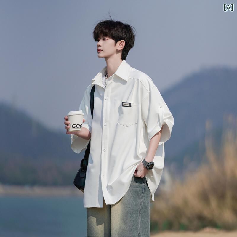 シャツ メンズ 半袖 薄手 夏用 日系 カジュアル きれいめ レトロ スタイリッシュ ルーズフィット ポリエステル素材 防シワ加工 快適 通気性 ポケット付き 白 黒 普段使い