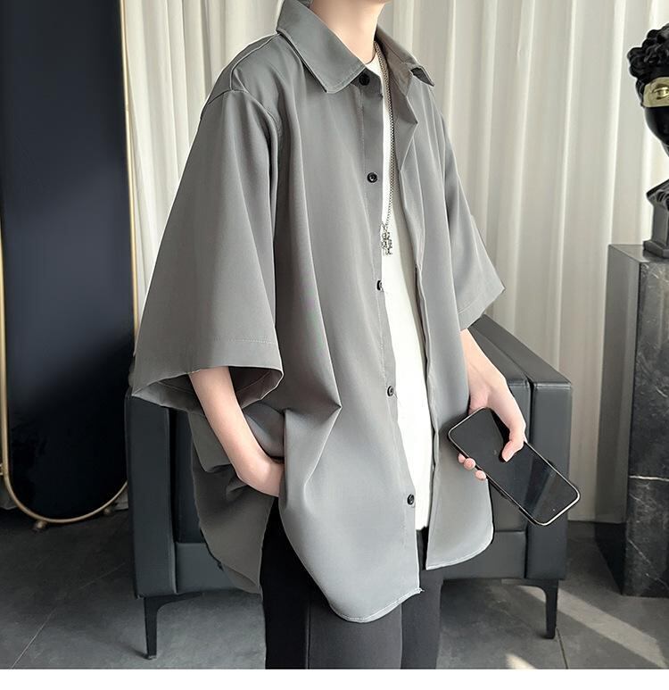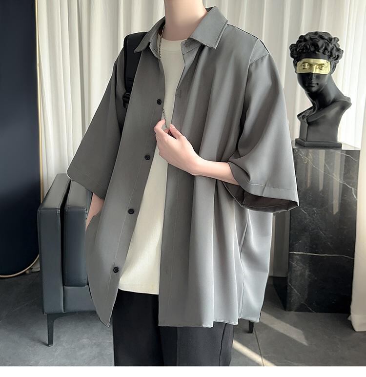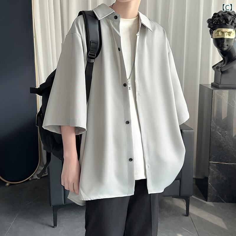 ・カテゴリ: シャツ・スタイル: カジュアル・主な素材: アセテート96%以上・フィット: ルーズフィット・ネックライン: 襟付き・袖丈: 半袖・柄: 無地・対象: 成人・性別: メンズ・カラー展開: ブラック、ダークグレー、ライトグレー、ダークブルー・サイズ展開: M、L、XL、XXL