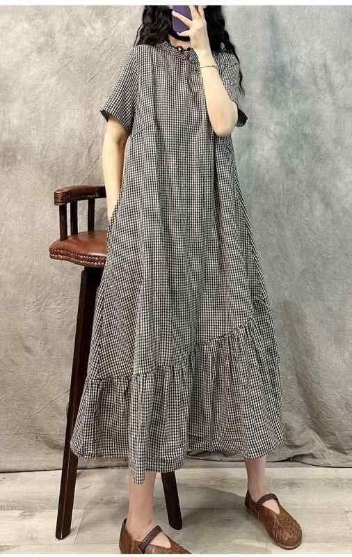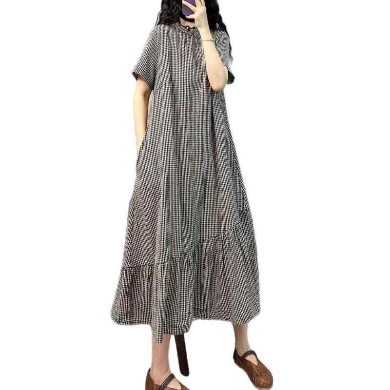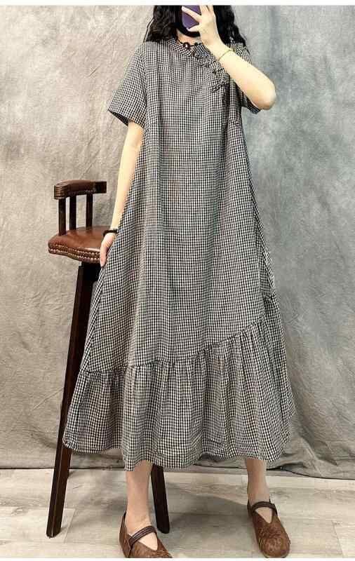 ワンピース レディース 新中華風 レトロ ヴィンテージ 綿麻 ポリエステル ゆったり 体型カバー ロング丈 半袖 スタンドカラー チェック柄 飾りボタン Aライン