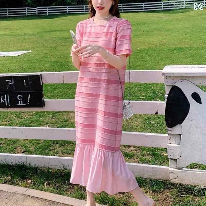 ワンピース レディース ストライプ ドーパミンカラー パッチワーク 切り替え ピンク ゆったり 着痩せ マーメイド Tシャツワンピース クルーネック 半袖 レース ナイロン ロング丈 ストリートスタイル 夏服 普段使い