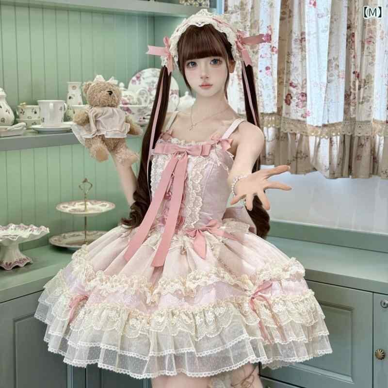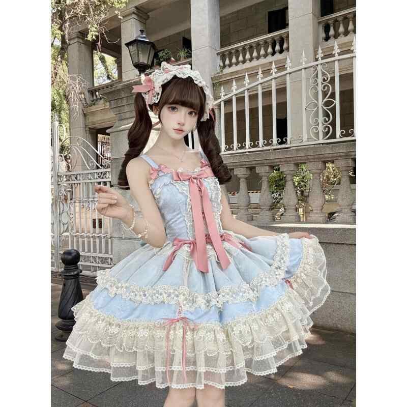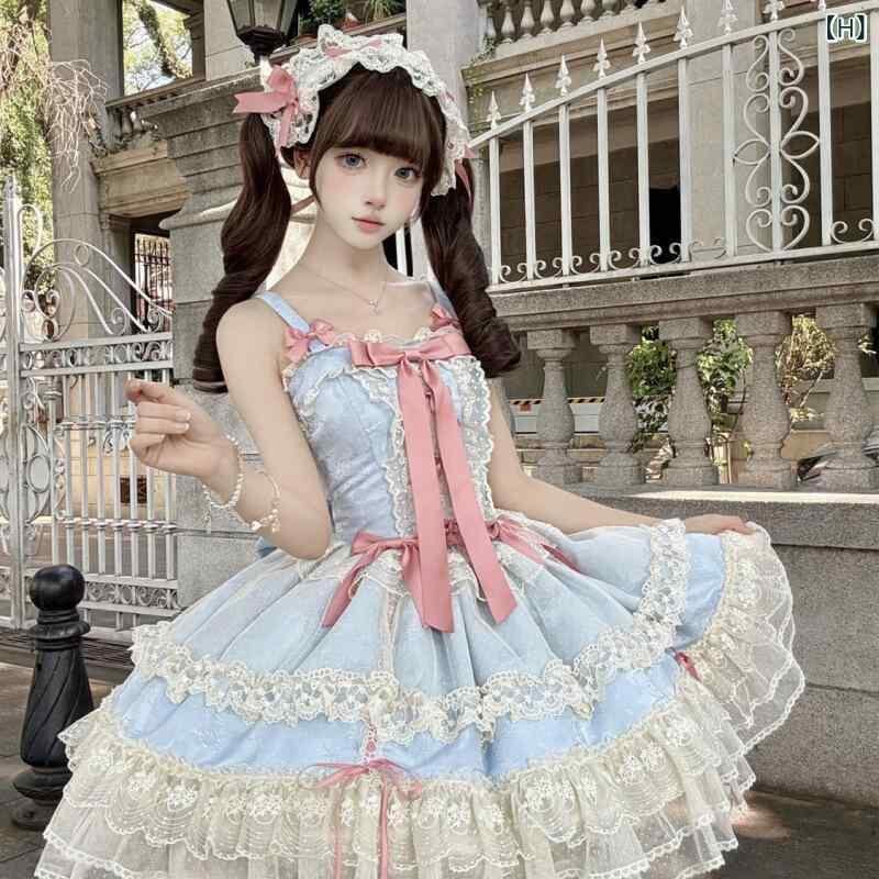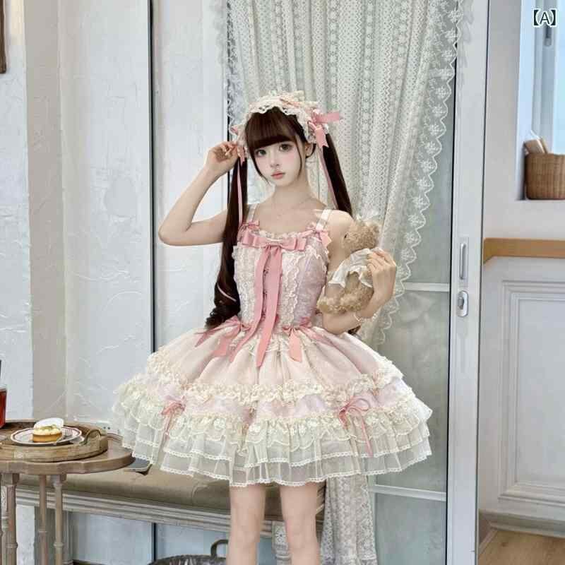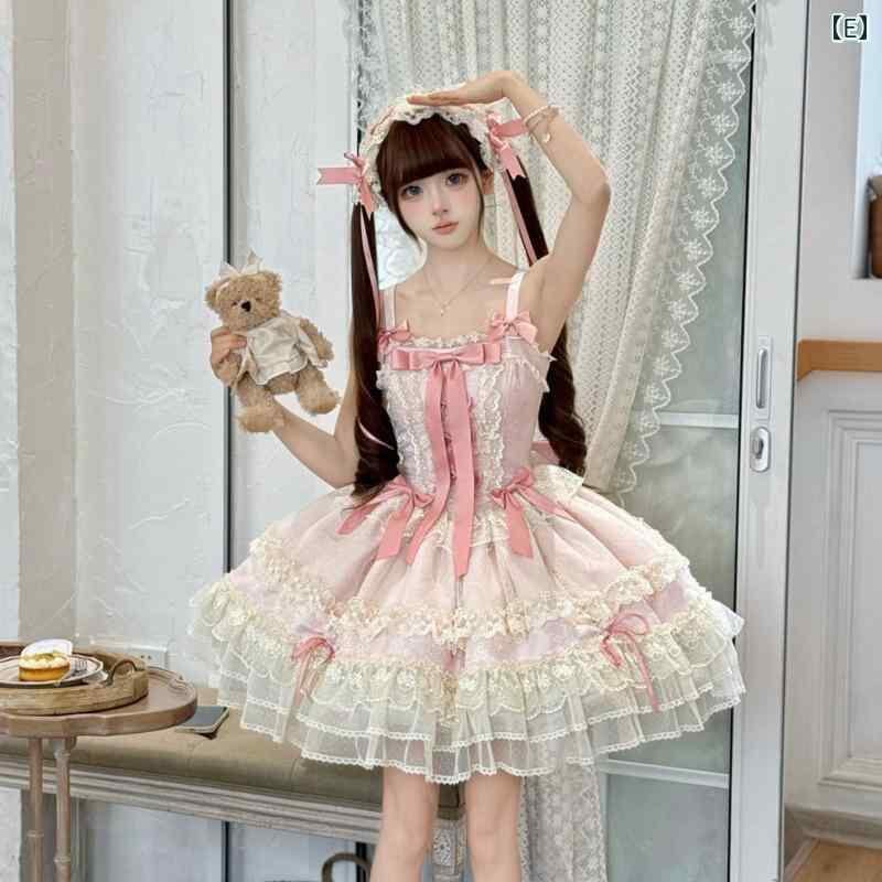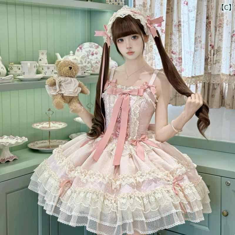 ワンピース レディース ロリータ バレエ風 JSK ジャンパースカート キャミソールワンピース リボン シャーリング ミニ丈 ショート丈 ストリート系 カジュアル ピンク ブルー 涼しい 軽量 快適