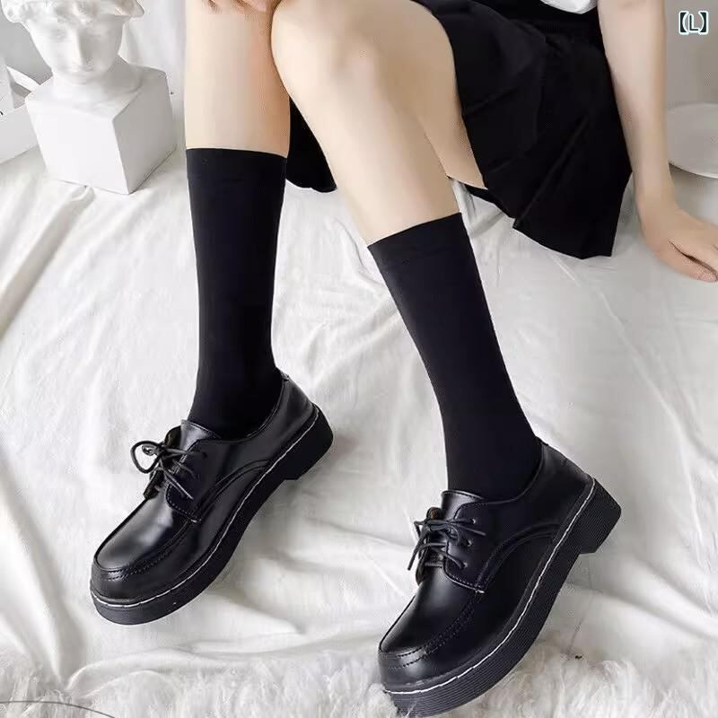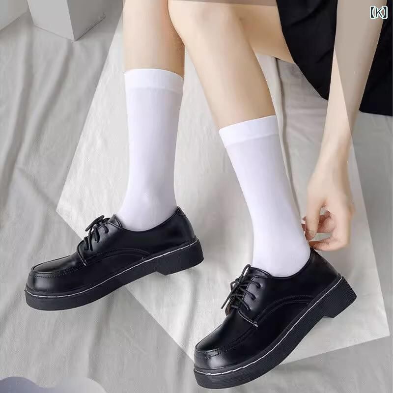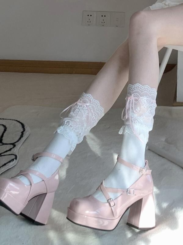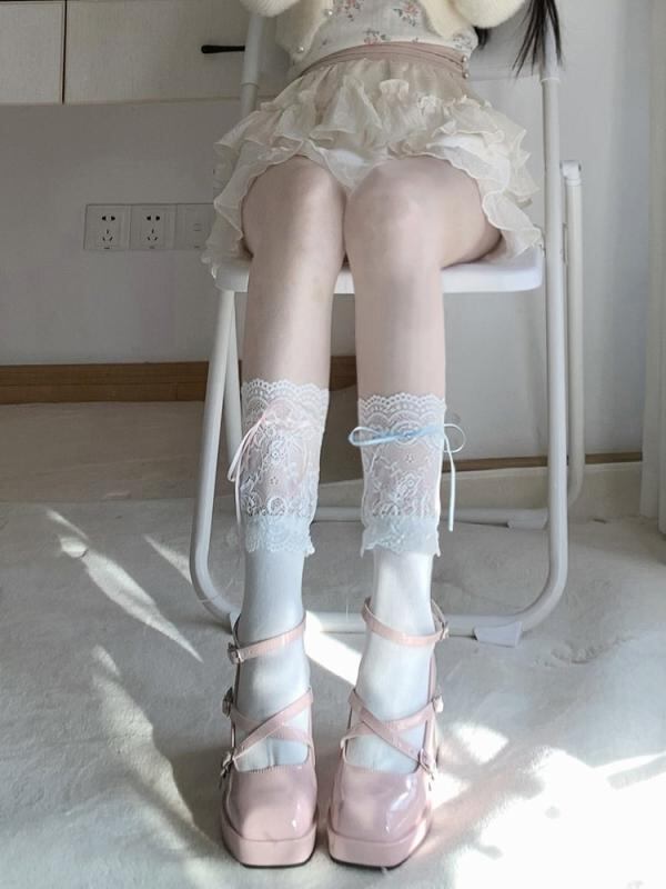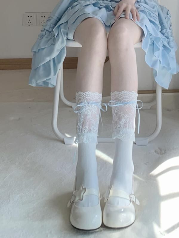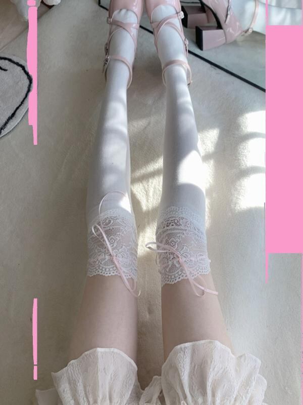 靴下 レディース 日本風 ロリータ 甘め かわいい レース フリル リボン クルー丈 ミドル丈 ニーハイソックス ホワイト ピンク ブルー ブラック