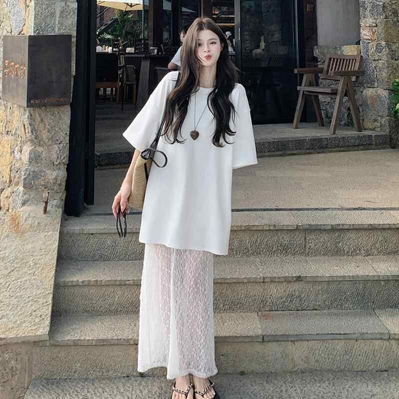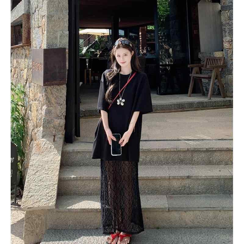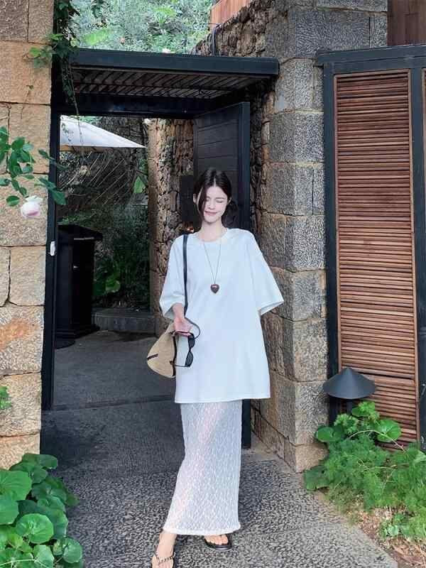 ワンピース レディース Tシャツ 重ね着風 レース切替 半袖 ロング丈 ゆったり リゾートスタイル Aライン クルーネック ハイウエスト エレガント ホワイト ポリエステル