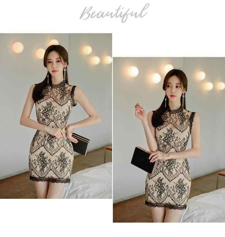 ワンピース レディース スリムフィット タイト ミニ丈 ノースリーブ スタンドカラー レース 切り替え フリル 韓国風 エレガント 名媛風 通勤 オフィススタイル ブラック アプリコット