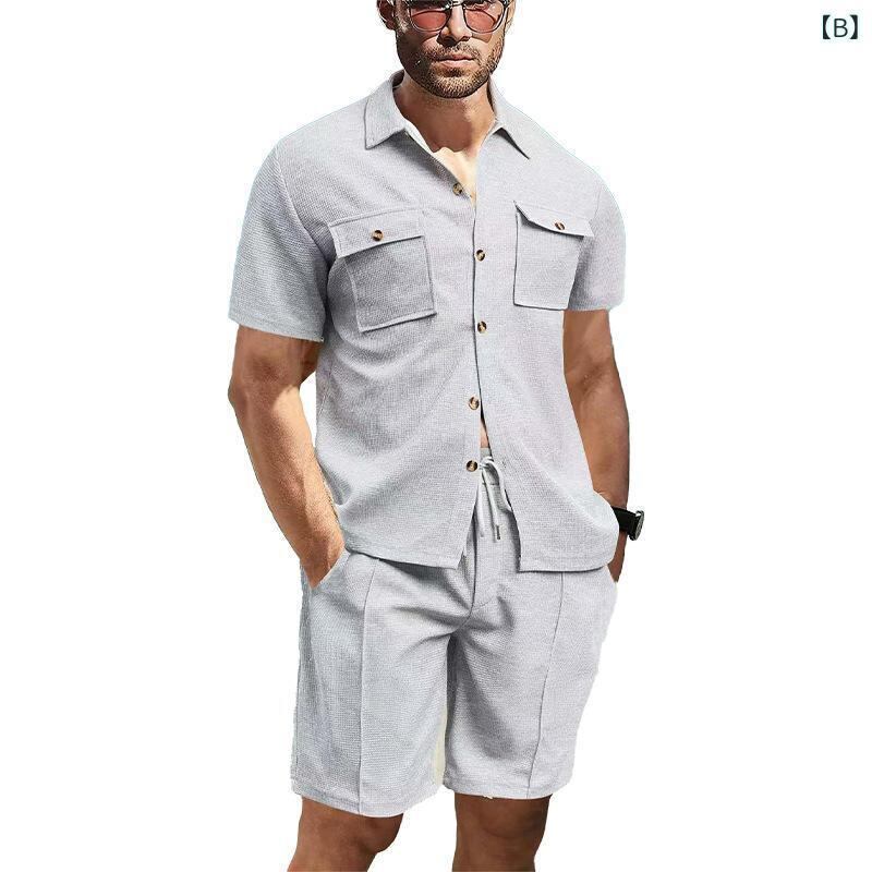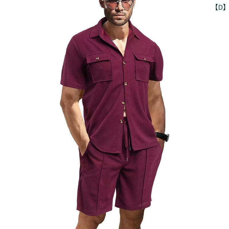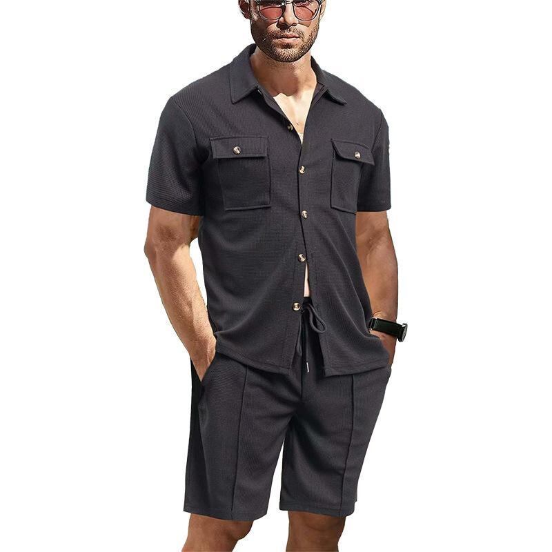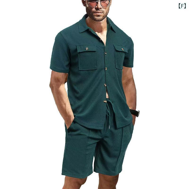 セットアップ メンズ 男性 夏 アメカジ ワーク 半袖シャツ ショートパンツ 上下セット ゆったり ルーズフィット ワッフル素材 ポリエステル カジュアル リラックスウェア 普段使い