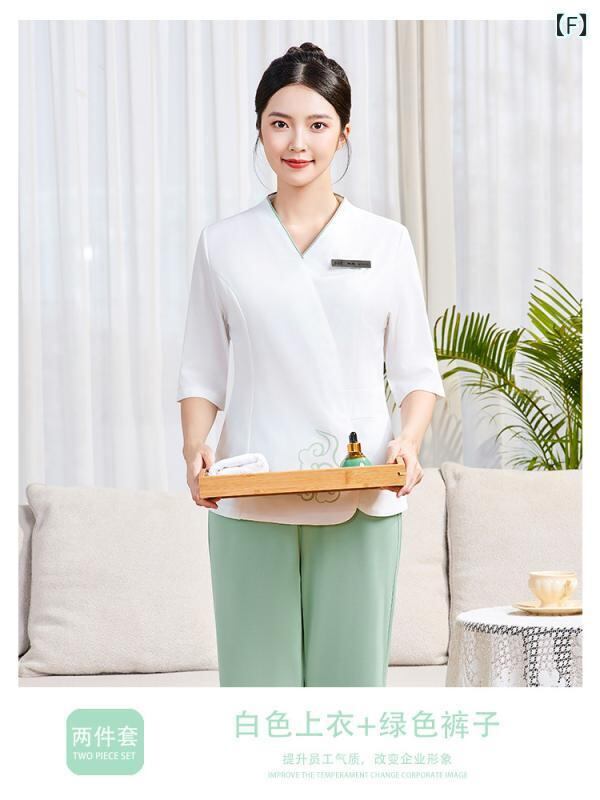 ユニフォーム レディース 高級感 吸湿速乾 ポリエステル スパンデックス Vネック 五分袖 セラピスト服 美容サロン ホテル スパ 整体 足浴 中華風 上下セット オールシーズン 作業着