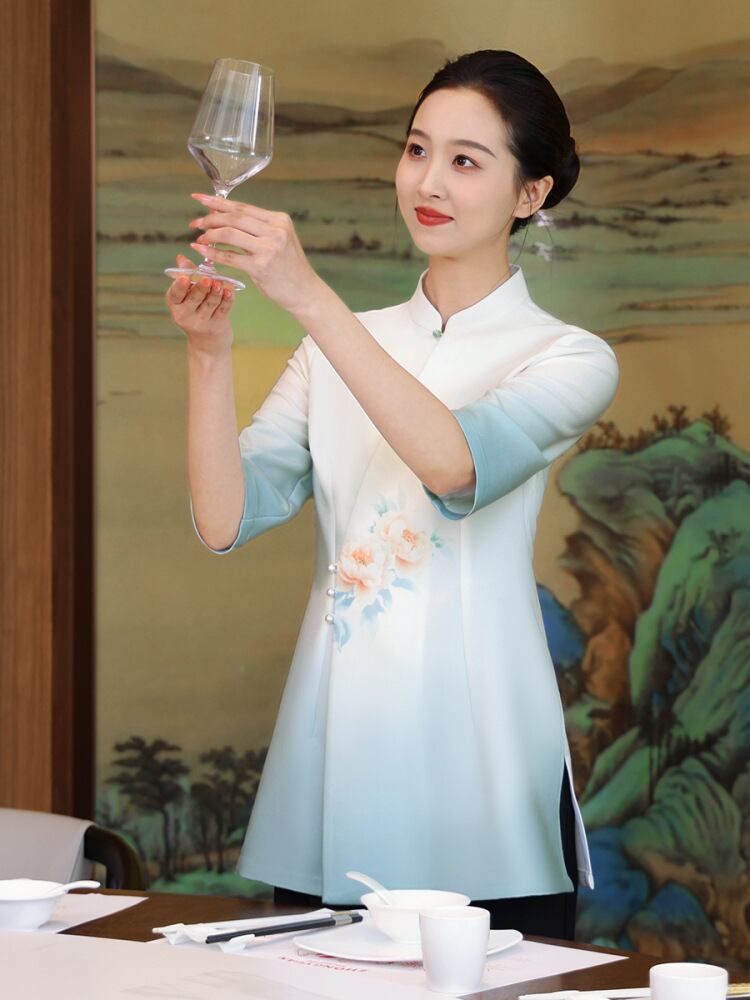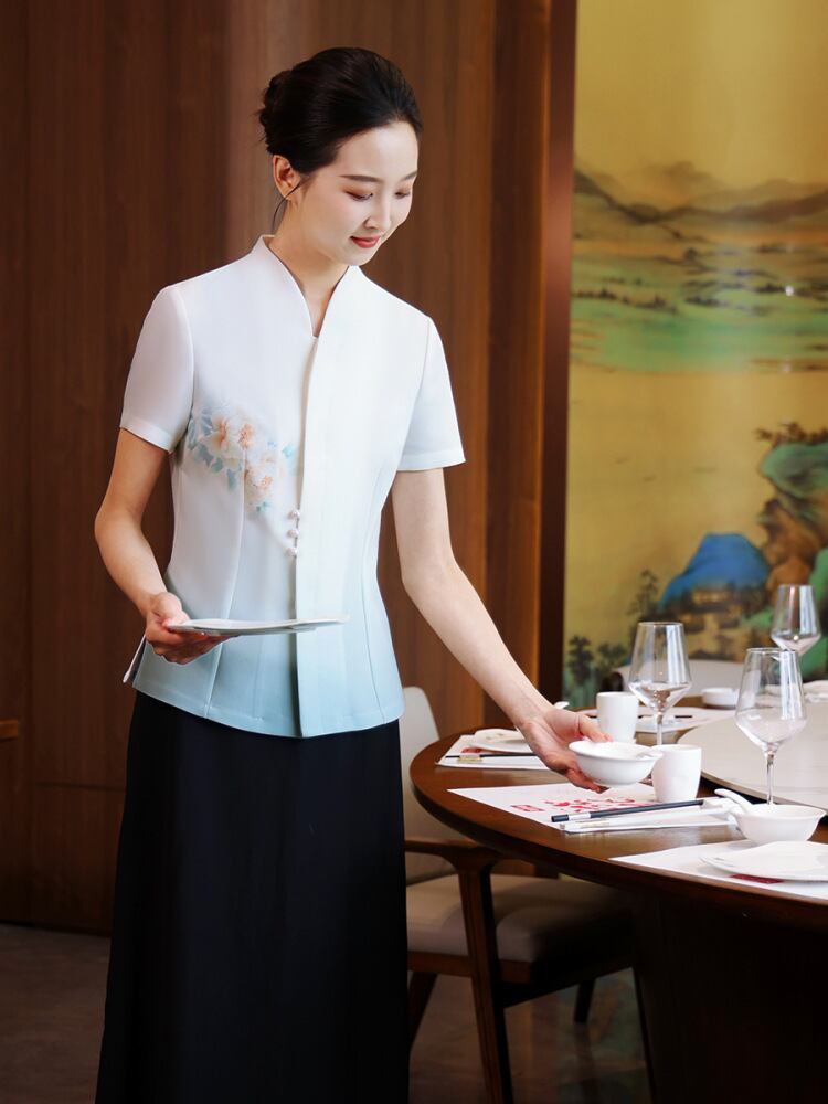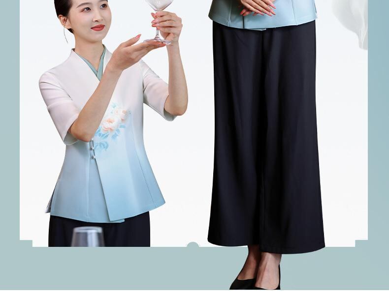 飲食店制服 レディース 高級感 ホテル レストラン 美容室 エステサロン 接客業 ユニフォーム 半袖 中華風 夏用 ポリエステル 防汚 Vネック 青黛色 牡丹柄