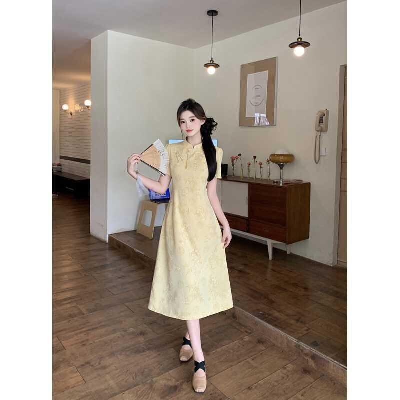 ワンピース レディース 大きいサイズ ゆったり 新中華風 チャイナドレス風 立襟 Aライン ロング丈 ショート丈 三分袖 デザイン ボタン 切替 ポリエステル 体型カバー 通勤 オフィス パーティー お呼ばれ グリーン イエロー ブラック