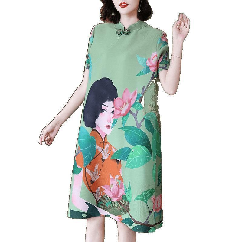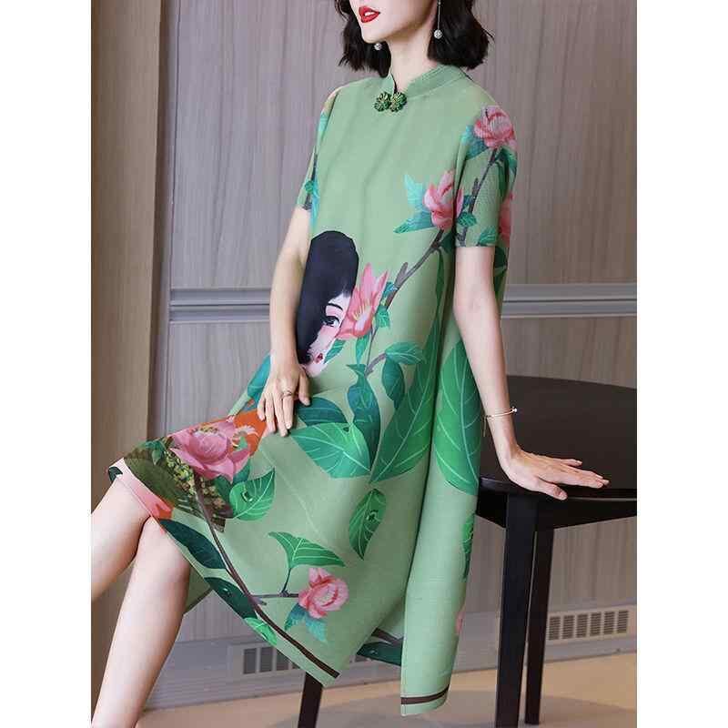 ワンピース レディース チャイナ風 民族風 上品 エレガント プリーツ加工 レトロ ヴィンテージ チャイナドレス風 チャイナボタン ミモレ丈 Aライン 体型カバー ゆったり 大きいサイズ 麻 リネン 半袖 スタンドカラー フリルスリーブ