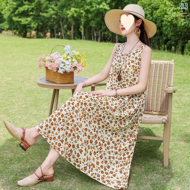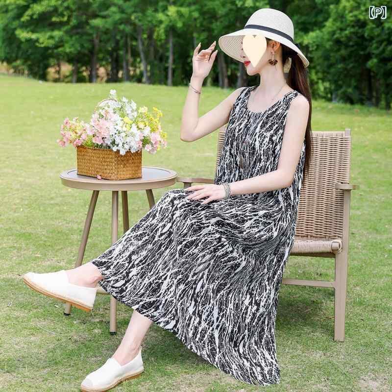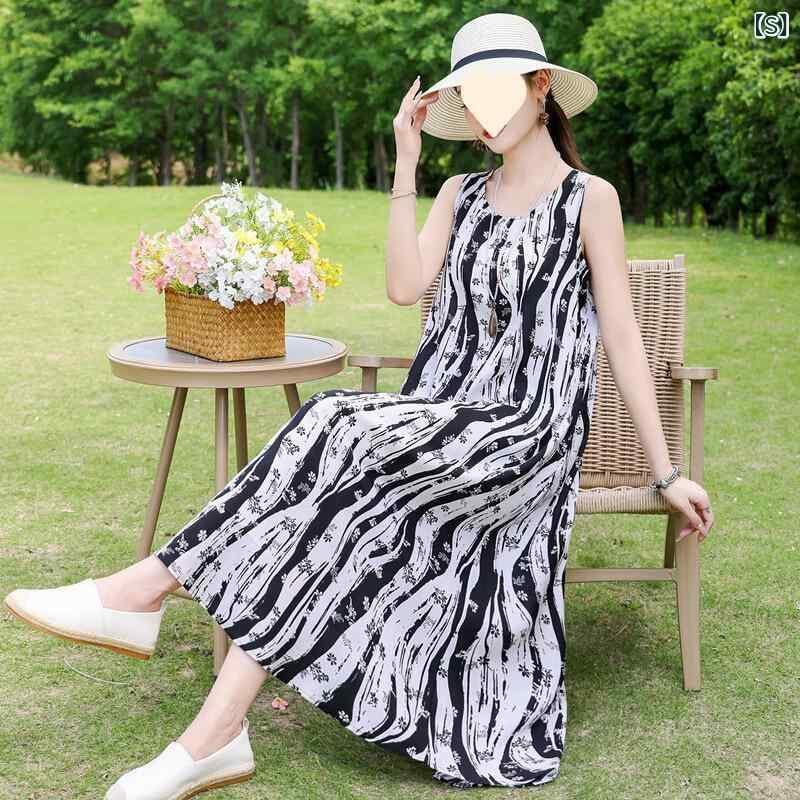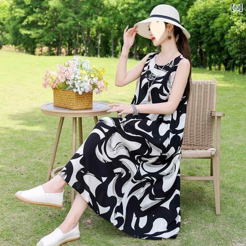 ワンピース レディース 夏 ノースリーブ ロング丈 大きいサイズ 着痩せ効果 レーヨン混 サマーワンピース 接触冷感 吸湿速乾 通気性 Aライン ビーチ リゾート 旅行 普段使い カジュアル