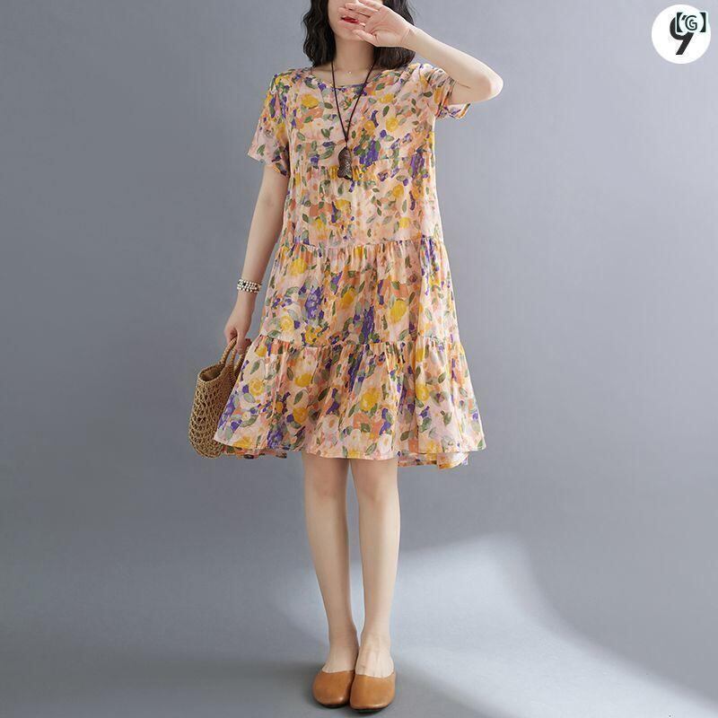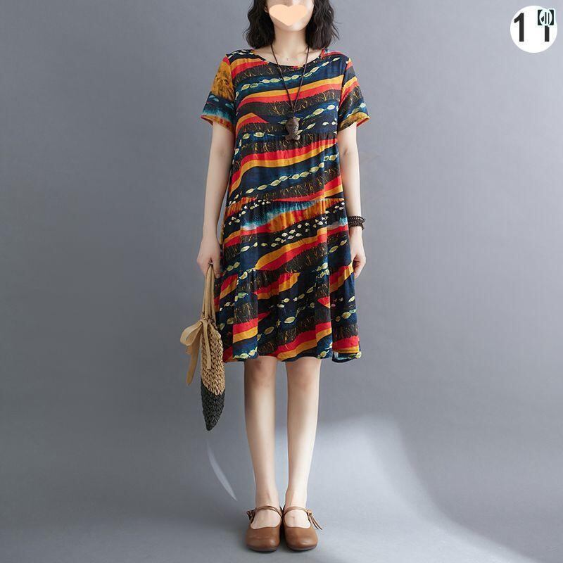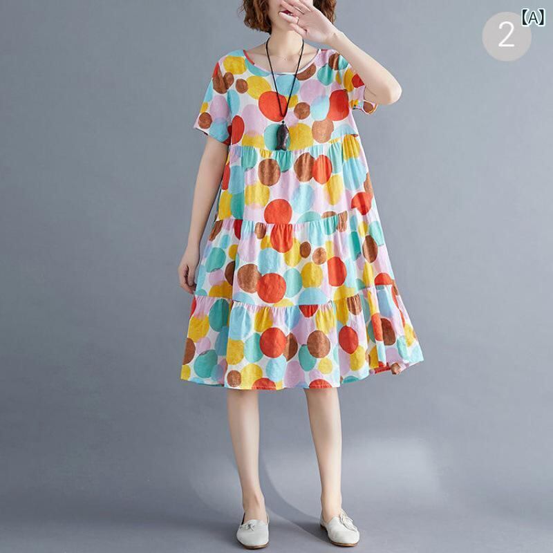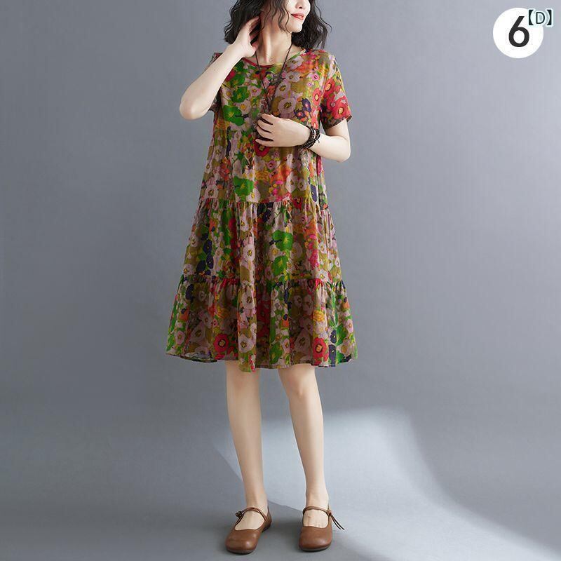 ワンピース レディース 綿麻 小花柄 半袖 スタンドカラー ゆったり 体型カバー 細見え ミモレ丈 カジュアル フェミニン シンプル デイリーユース 夏