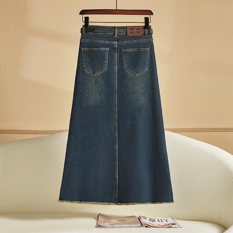デニム スカート レディース フリンジ レトロ ミディ丈 ハイウエスト 大きいサイズ 細見え バックスリット コットン デニム生地 ストレッチ ブルー 無地 ポケット付き 通勤 オフィス カジュアル きれいめ