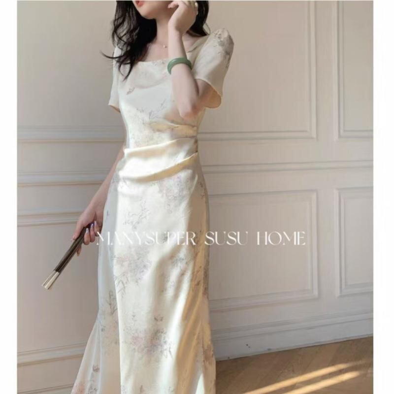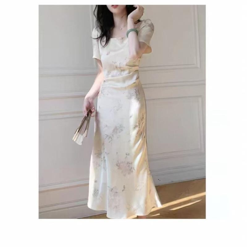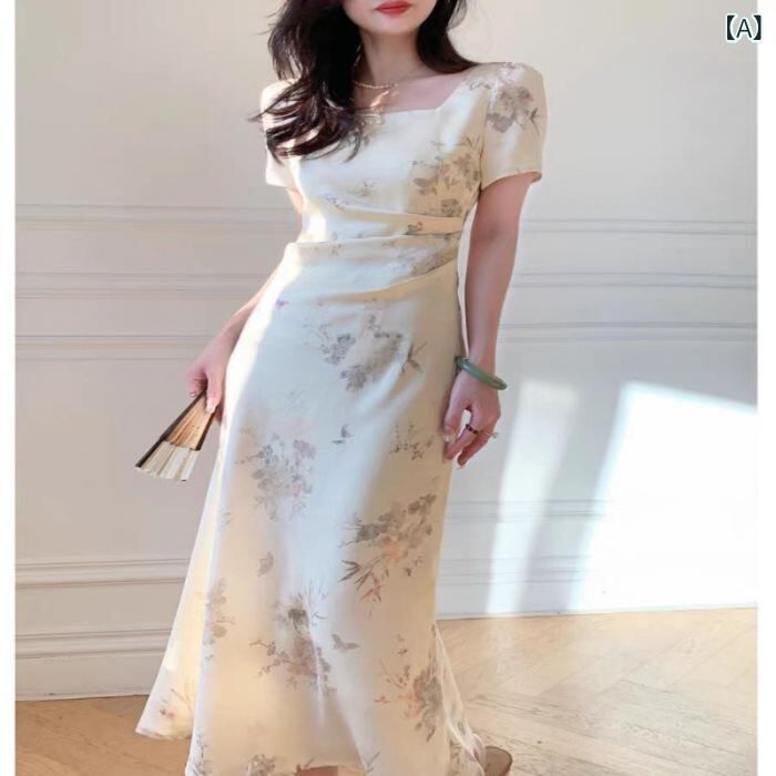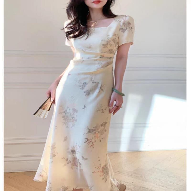 ワンピース 新チャイナ風 エレガント 上品 ミディ丈 Aライン スクエアネック 半袖 ハイウエスト ウエストギャザー プリント柄 大きいサイズ スタイルアップ 着痩せ オフホワイト TR素材