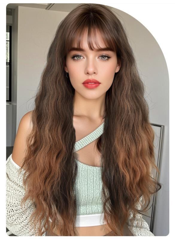 ウィッグ レディース ロングカール ぱっつん前髪 アッシュブラウン 上品 エレガント フェミニン 大人女性 お姫様風 夏 お出かけ 耐熱ファイバー 自然 日常使い スタイルチェンジ