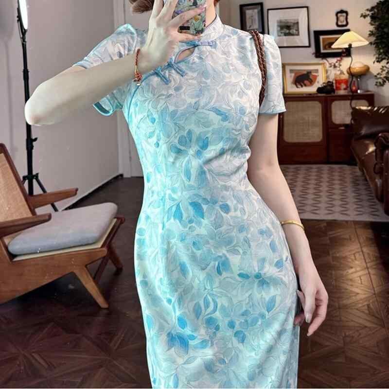 ワンピース レディース 新中国風 レトロチャイナ 上品 エレガント 華やか 着痩せ チャイナドレス 花柄プリント ロング丈 半袖 Aライン ハイウエスト スタンドカラー ポリエステル素材 ブルー