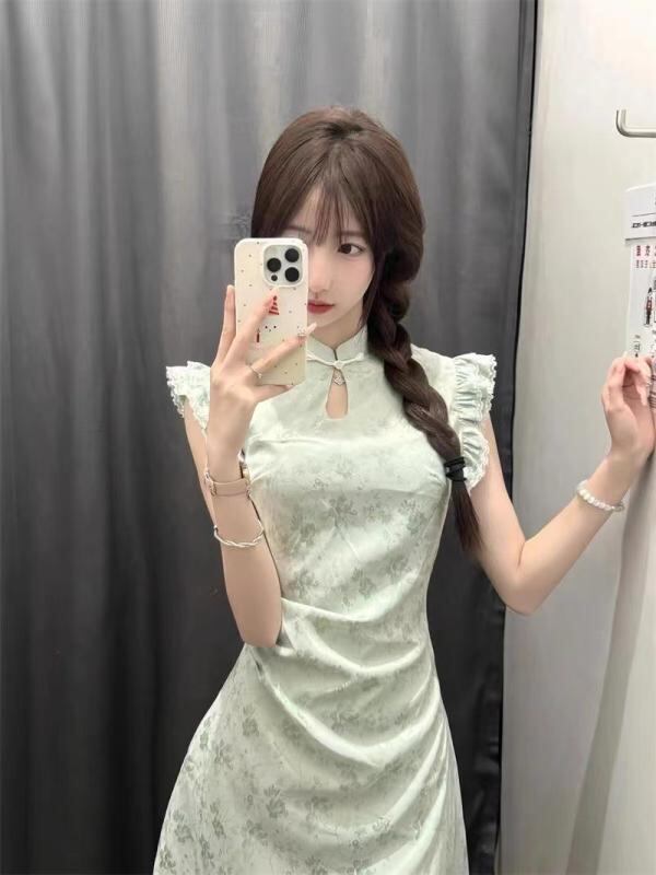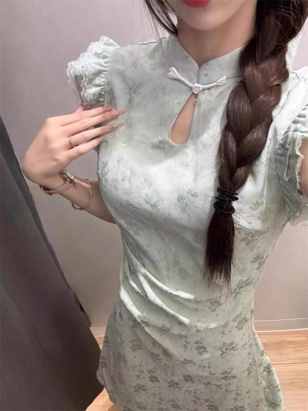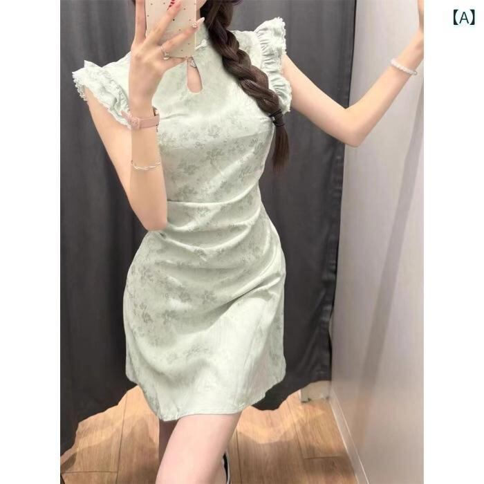 ワンピース レディース 夏用 改良チャイナドレス風 レトロモダン 上品 高級感 ウエストマーク ショート丈 フリル袖 グリーン ポリエステル プリント プリーツ チャイナカラー