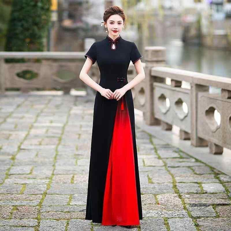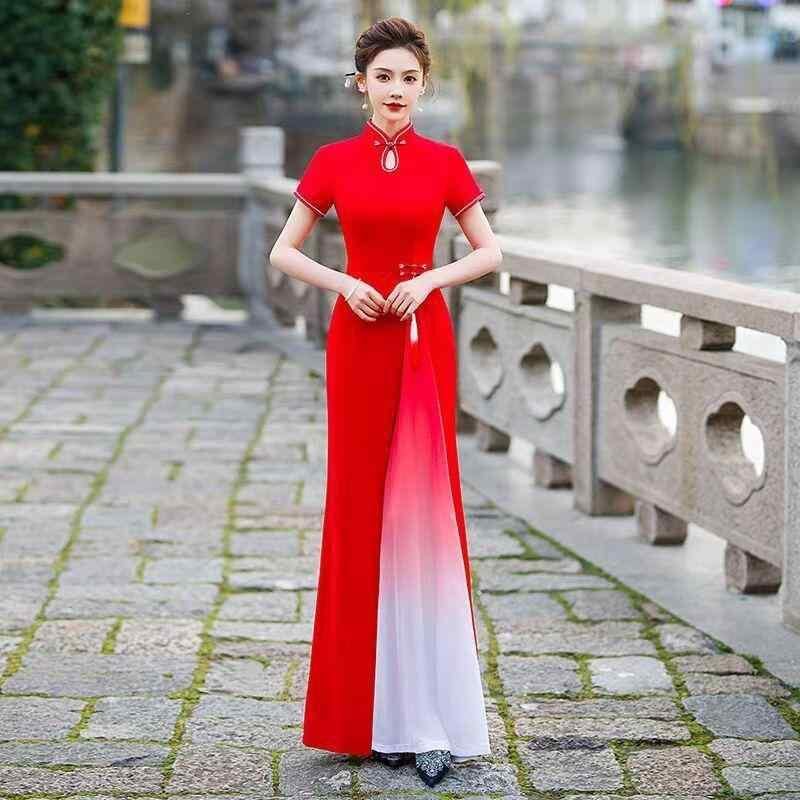 ドレス レディース 改良型 チャイナドレス アオザイ ロング丈 ノースリーブ 舞台 ダンス 衣装 発表会 フォーマル イベント 高級感 エレガント 上品 刺繍 シェニール スパンデックス ストレッチ素材
