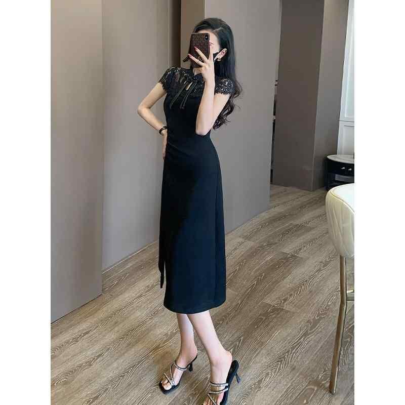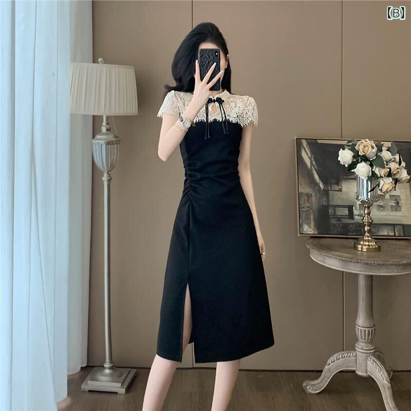 ワンピース レディース 中国風 旗袍 レース切替 エレガント 着痩せ効果 スタンドカラー ハイウエスト 半袖 ミディ丈 綿 タイトシルエット レトロ クラシカル 上品 お呼ばれ フォーマル
