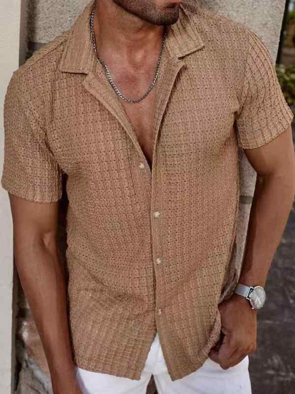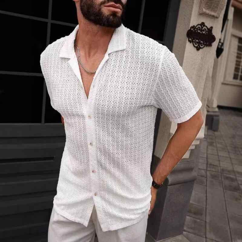 シャツ メンズ 半袖 ニットシャツ 襟付き カジュアル 透かし編み 薄手 通気性 涼しい 麻混 ポリエステル素材 ノーアイロン ストレッチ 無地 ビッグサイズ 丈夫 夏服