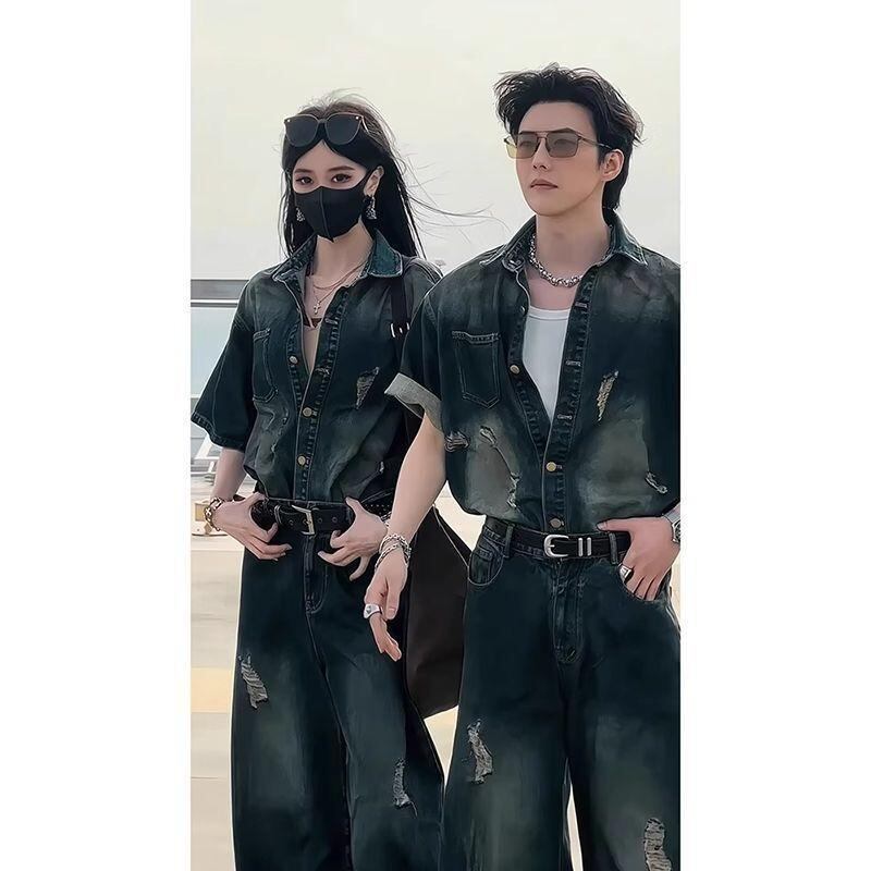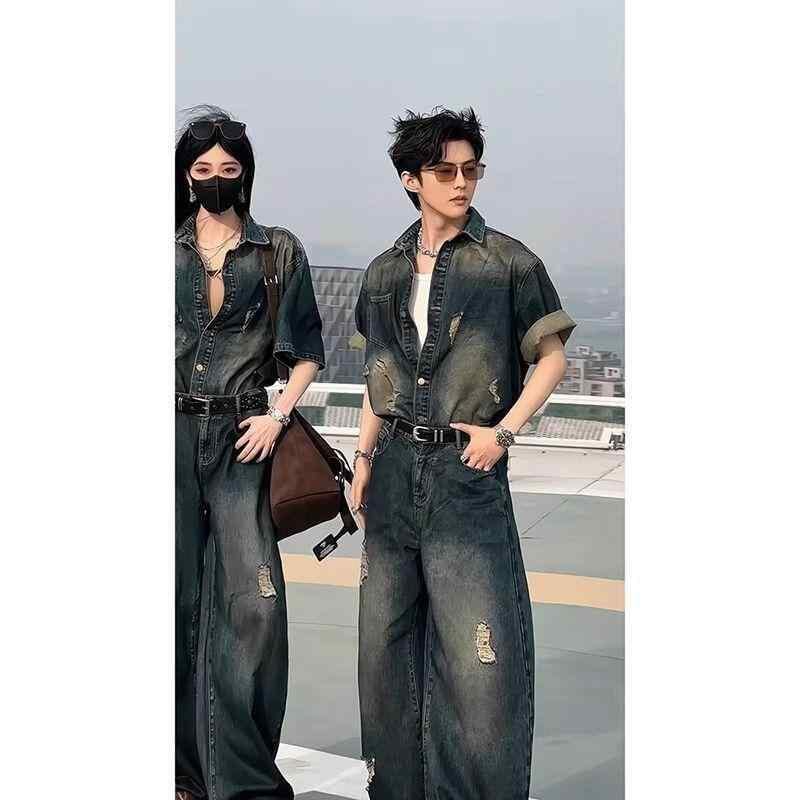メンズ カジュアル セットアップ デニム 半袖シャツ ダメージ加工 ジーンズ 夏服 クール スタイリッシュ アメカジ ストリート系 普段使い お出かけ コットン ブルー 上下セット