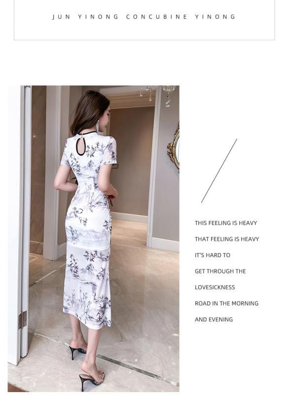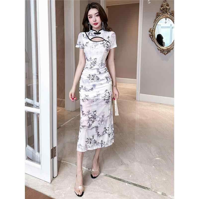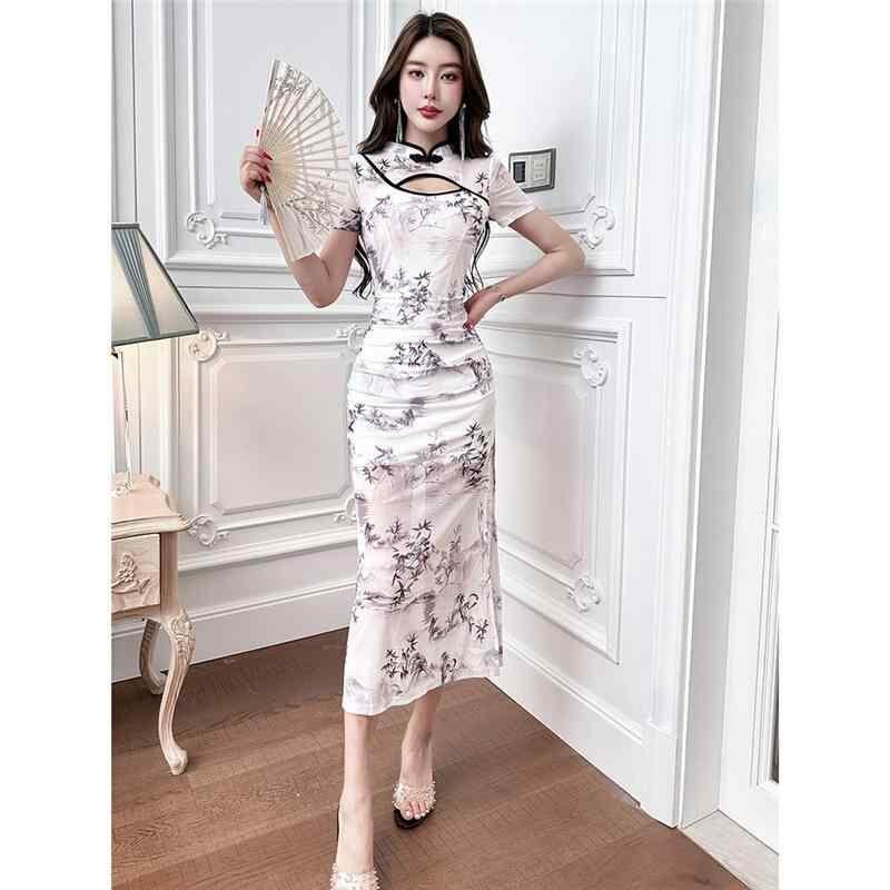 ワンピース レディース セクシー 改良チャイナドレス ロング丈 ポロ襟 半袖 PVC素材 切替デザイン レトロ ホワイト イブニングドレス タイト ボディコン 制服 ナイトワーク