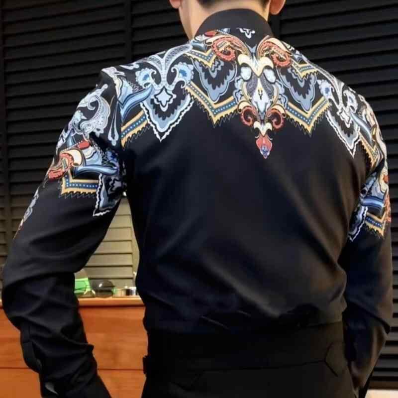 シャツ メンズ 高級感 紳士 華やか シンメトリー柄 プリント 長袖 スタンドカラー スリムフィット 個性的 ポリエステル 裏起毛 ホワイト 大きいサイズ ビジネス カジュアル フォーマル