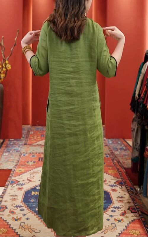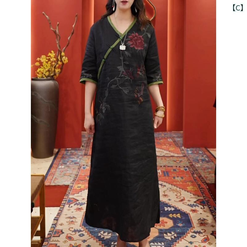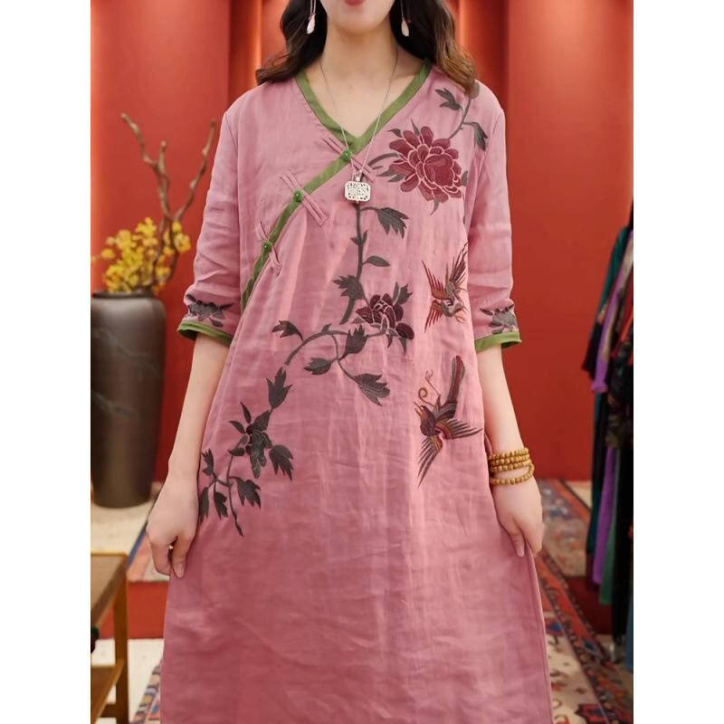 ワンピース レディース 中国風 新中華風 レトロ 改良旗袍 刺繡 Vネック 短袖 ショートスリーブ ゆったり 体型カバー 大きいサイズ Aライン ロング丈 綿麻 コットンリネン ポケット フロッグボタン スリット 花柄 桃粉 グリーン ブラック