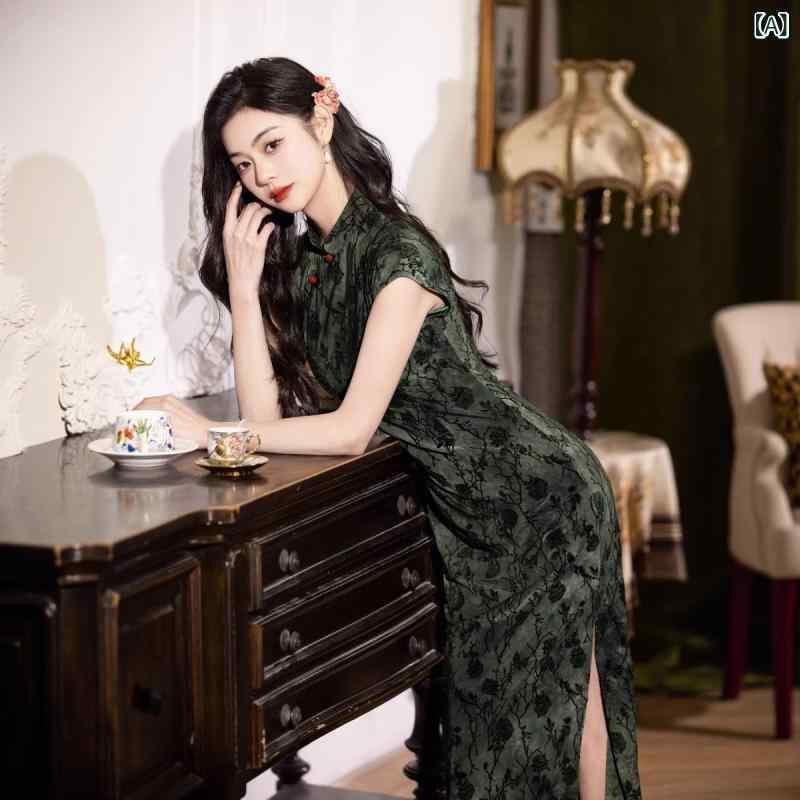 チャイナドレス レディース 上海風 ロング丈 大きいサイズ 体型カバー 着痩せ効果 中国風 クラシック レトロ ヴィンテージ デヴォーレ柄 フロッキー加工 絞り染め スタンドカラー 斜め合わせ 裾スリット ポリエステル 伸縮性あり