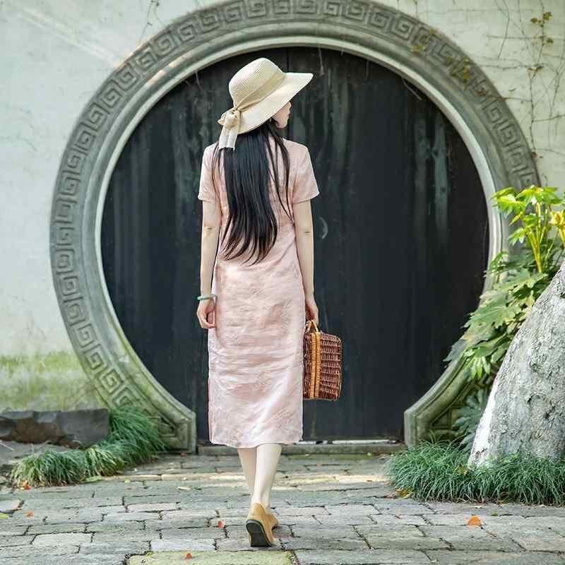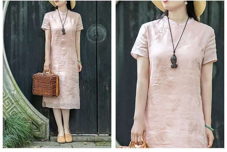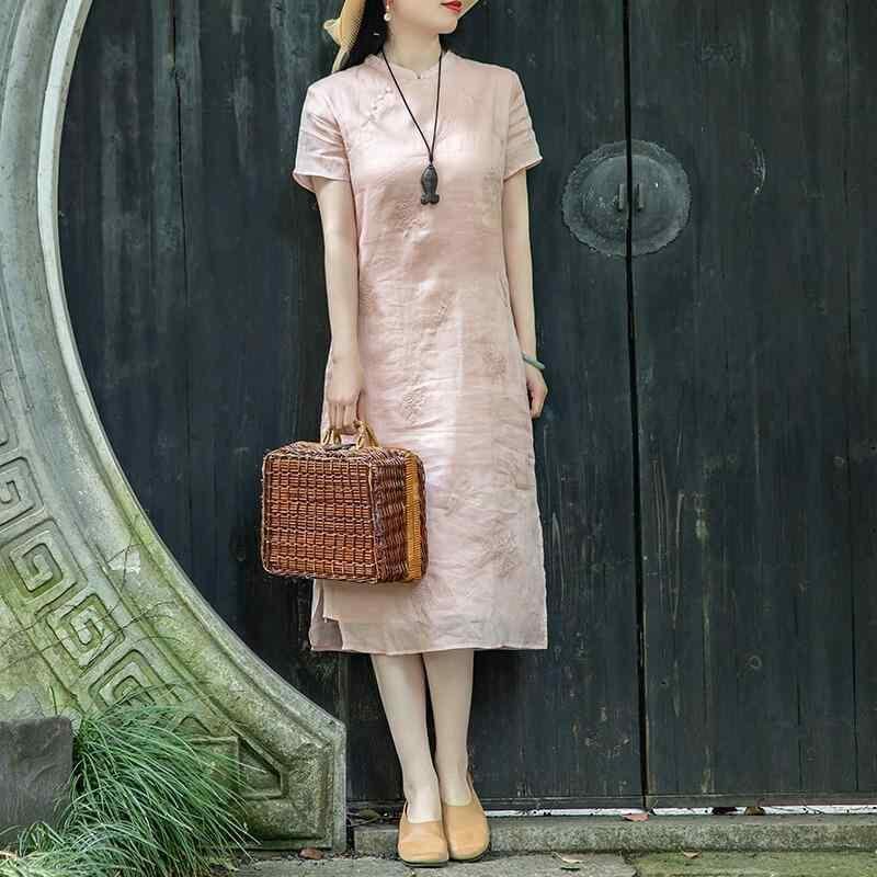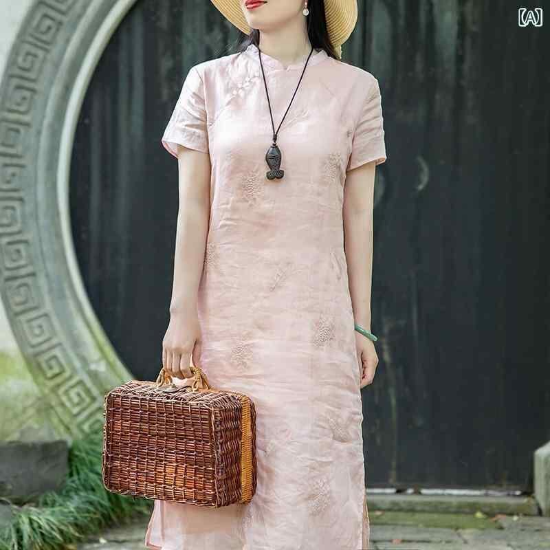 ワンピース レディース 高級感 上品 エレガント 新中華風 改良チャイナドレス 中国風 綿麻 リネン 夏 ゆったり 大きいサイズ Aライン ミディ丈 スタンドカラー 半袖 刺繍 プルオーバー レトロ