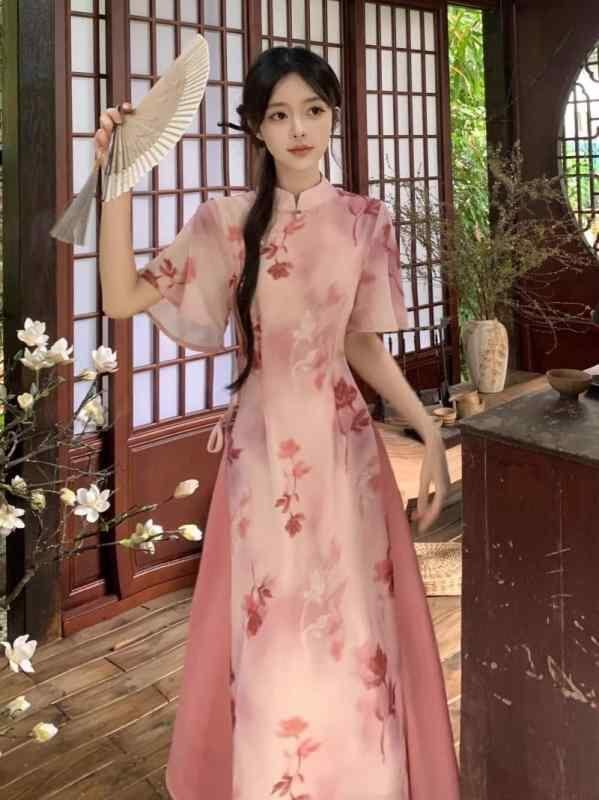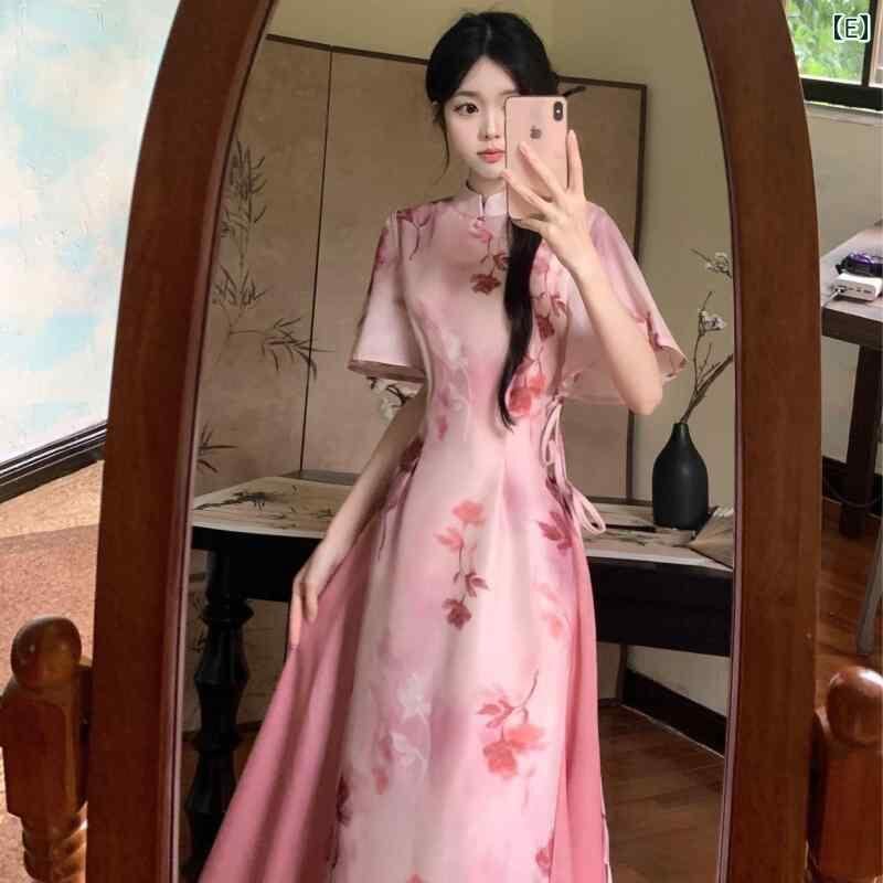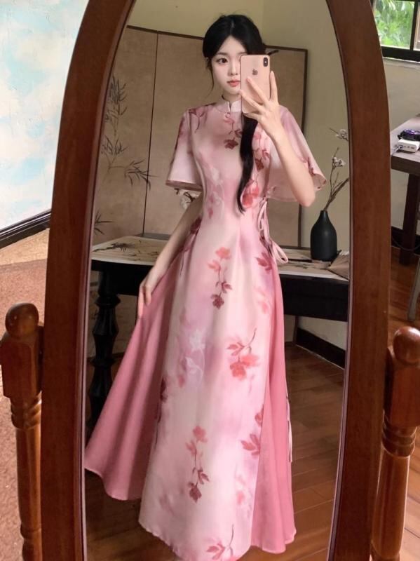 チャイナドレス レディース プラスサイズ 新チャイニーズスタイル レトロ モダン 改良型 エレガント 優美 上品 ノースリーブ ロング丈 フェイクレイヤード プリント柄 シェニール素材 伸縮性 ワンピース 通勤スタイル