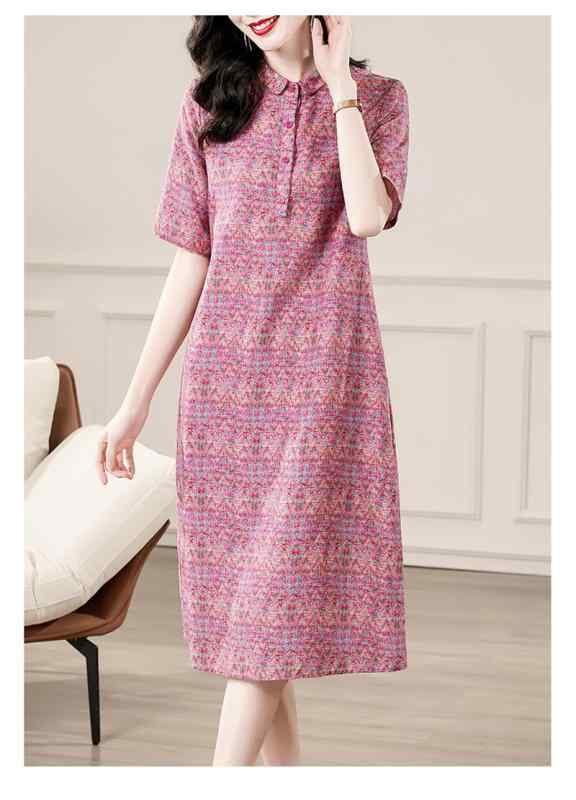 ワンピース レディース 綿麻 レトロ 文芸 大きいサイズ ゆったり 着痩せ 上品 ミモレ丈 チェック柄 プリント プルオーバー Aライン 小襟 半袖 ウエストゆったり シンプル フューシャピンク
