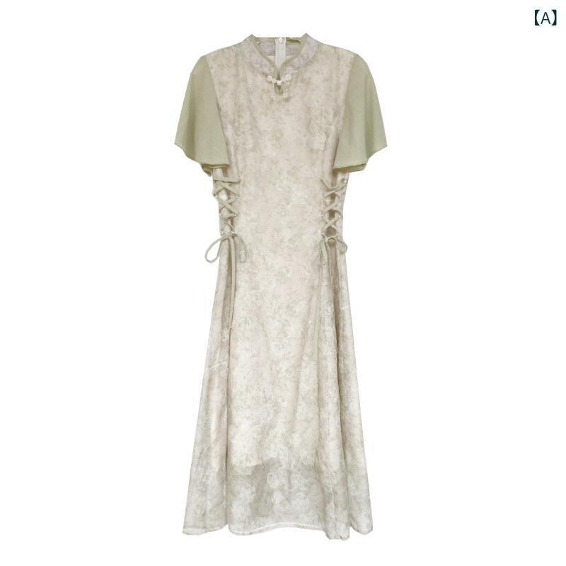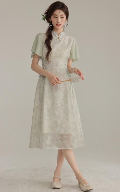 ワンピース 改良型 チャイナドレス風 中国風 ミントグリーン スタンドカラー 半袖 ウエストマーク Aライン ミディ丈 小花柄 ハイウエスト レトロ クラシカル エレガント ポリエステル リラックス お出かけ 普段使い