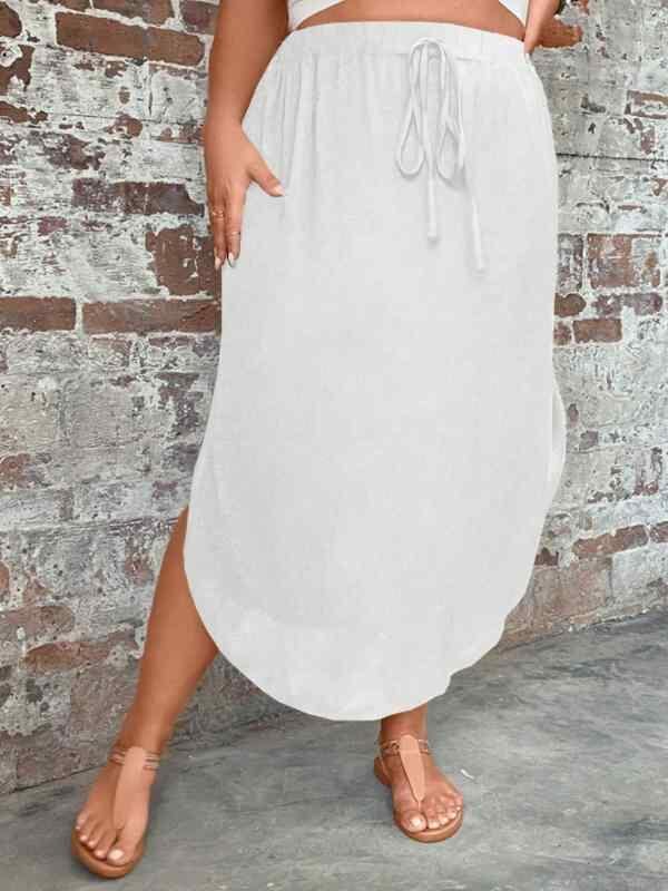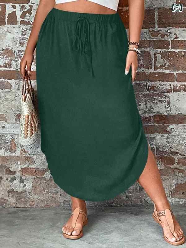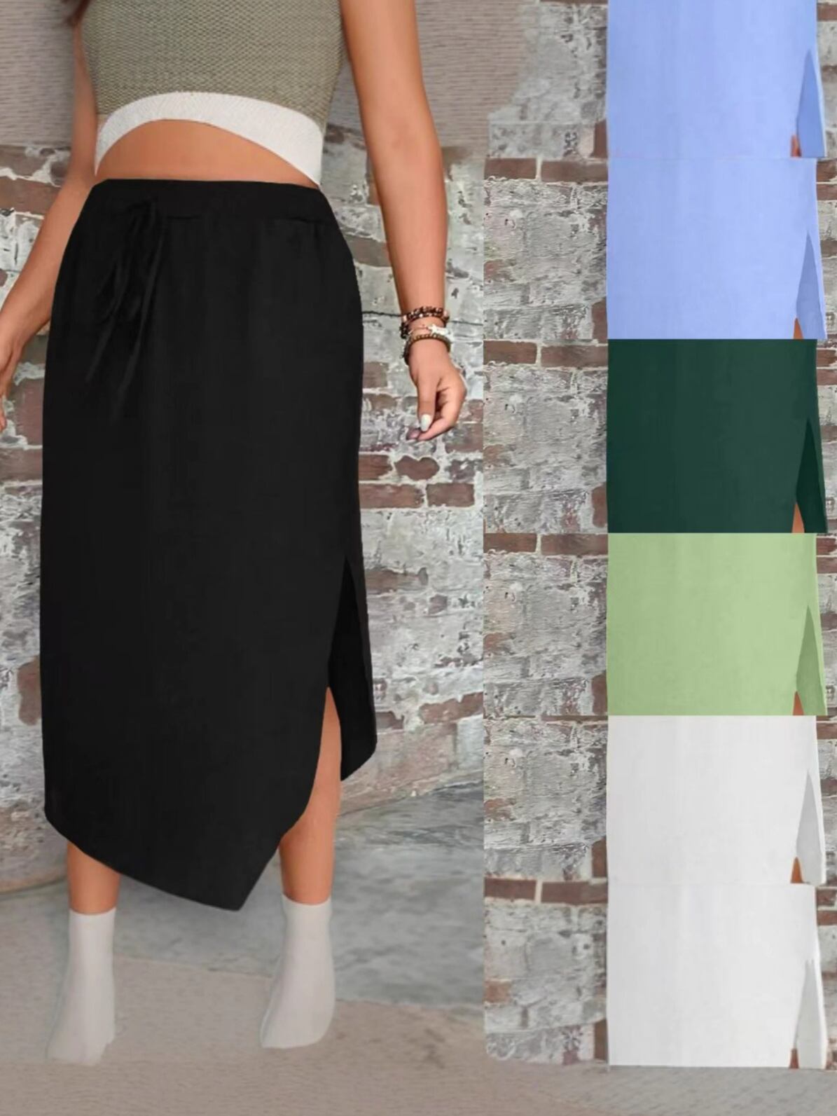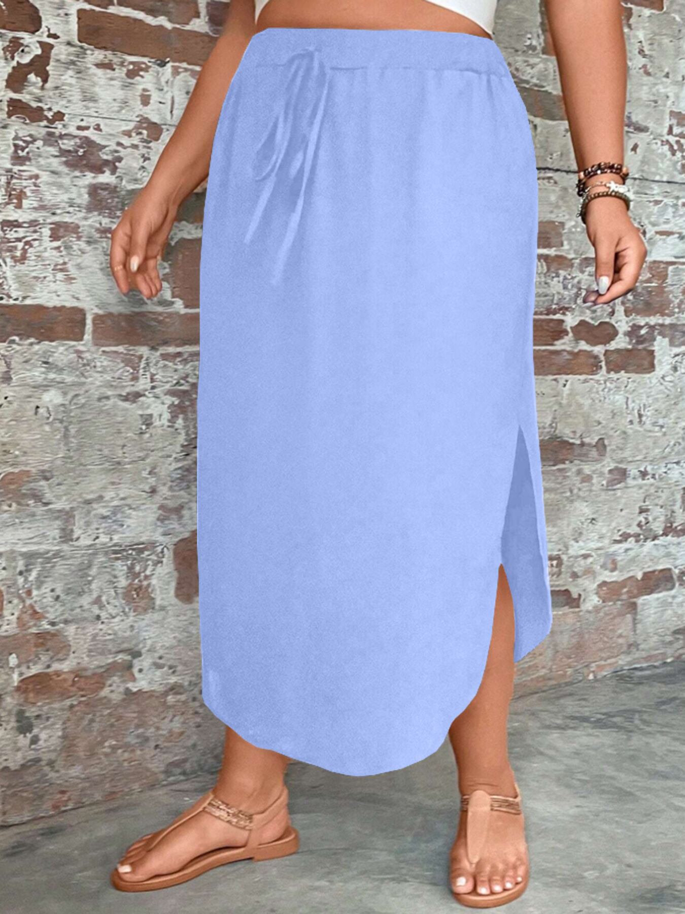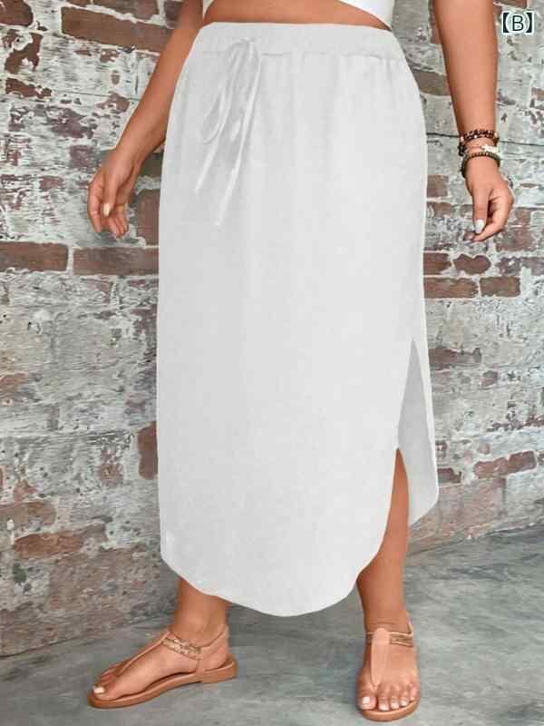 スカート レディース 大きいサイズ プラスサイズ 無地 スリムフィット タイト ウエストリボン スリット入り ミディ丈 タイトスカート カジュアル 普段使い ポリエステル ポリウレタン ストレッチ素材