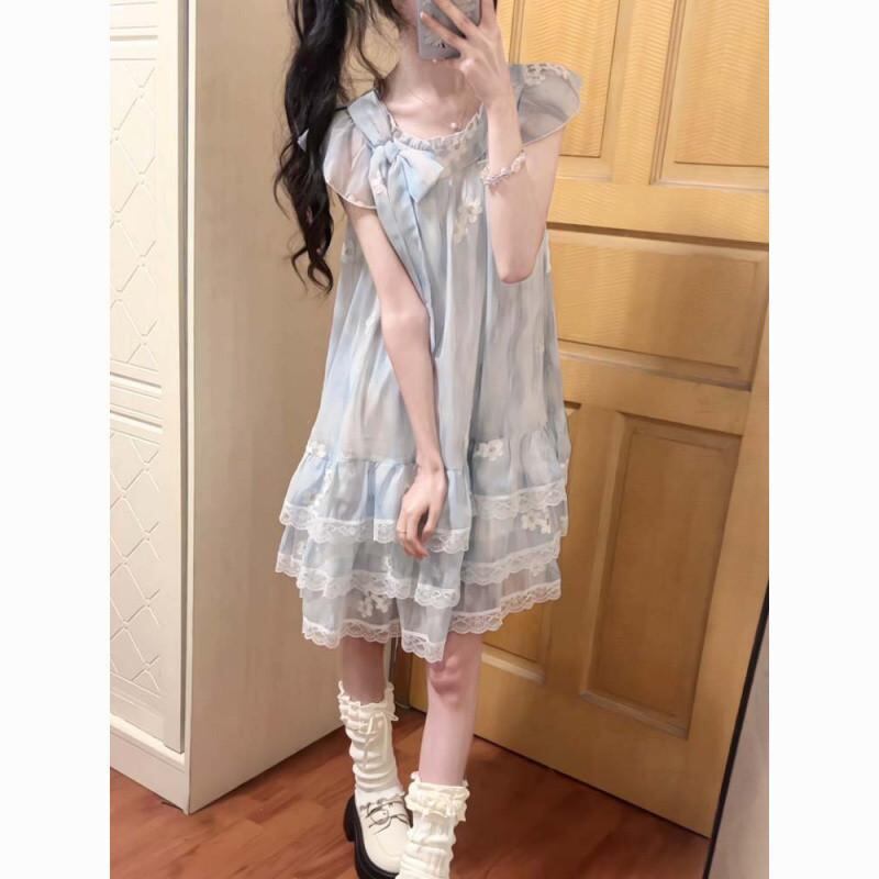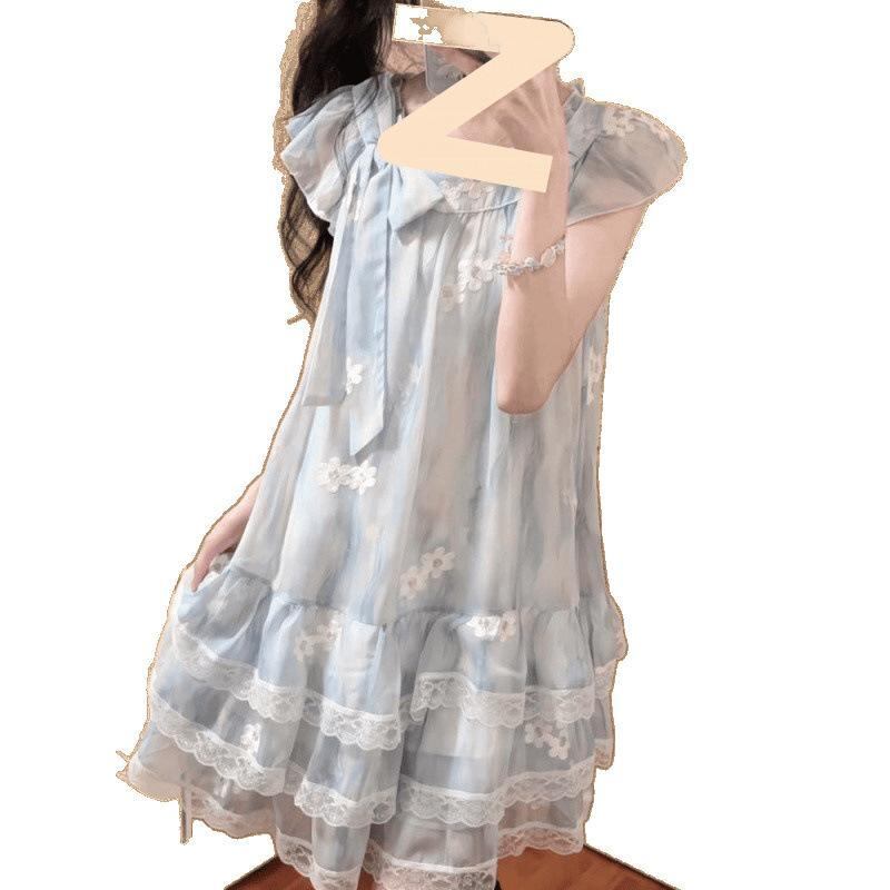 ワンピース レディース 小柄 フレンチスタイル ブルー 波柄 刺繍 レース リボン ティアードスカート ショート丈 ラウンドネック ノースリーブ ポリエステル フェミニン ガーリー 学生向け 普段使い
