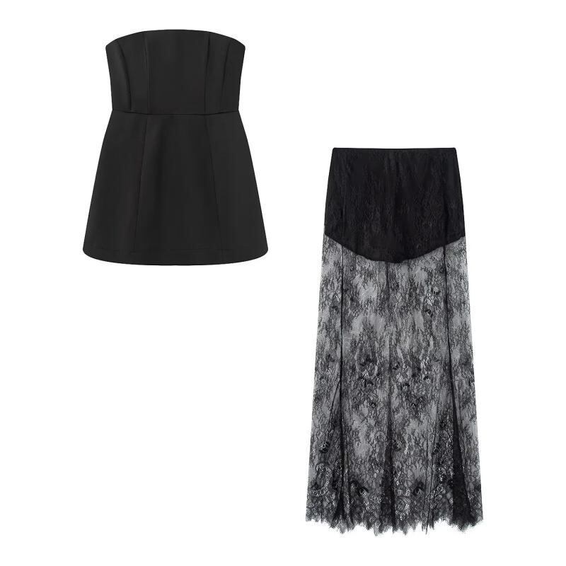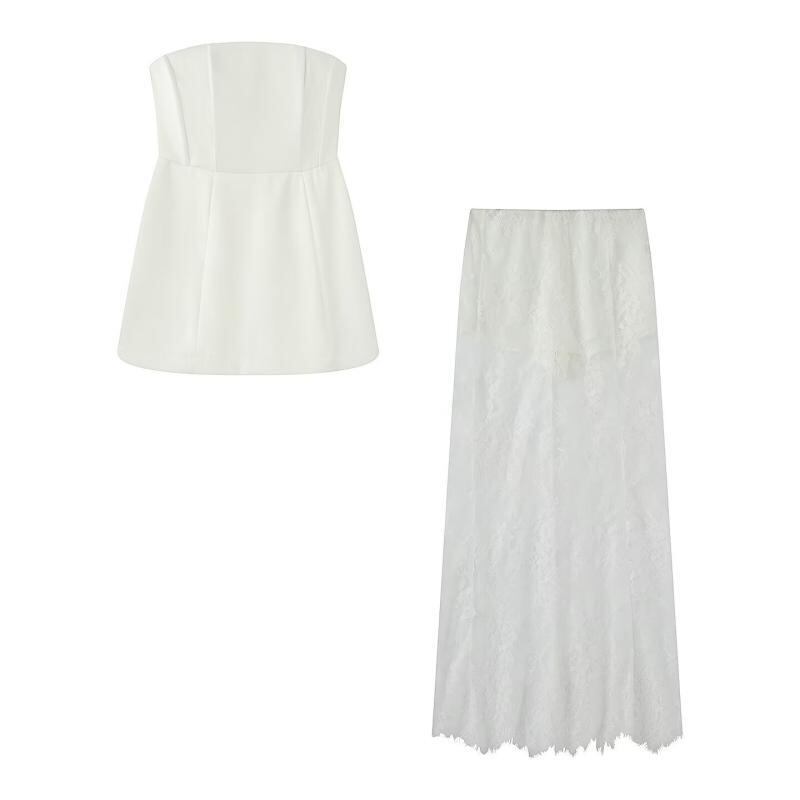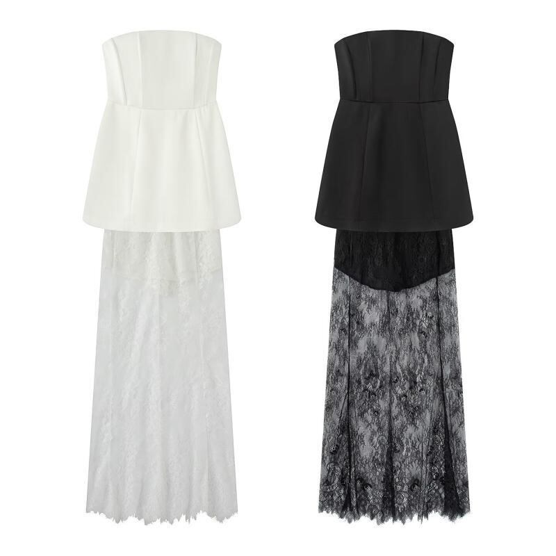 スカートセットアップ レディース 欧米風 ウエストマーク ノースリーブ チューブトップ ハイウエスト レース ロングスカート ポリエステル素材 普段使い ストリートカジュアル