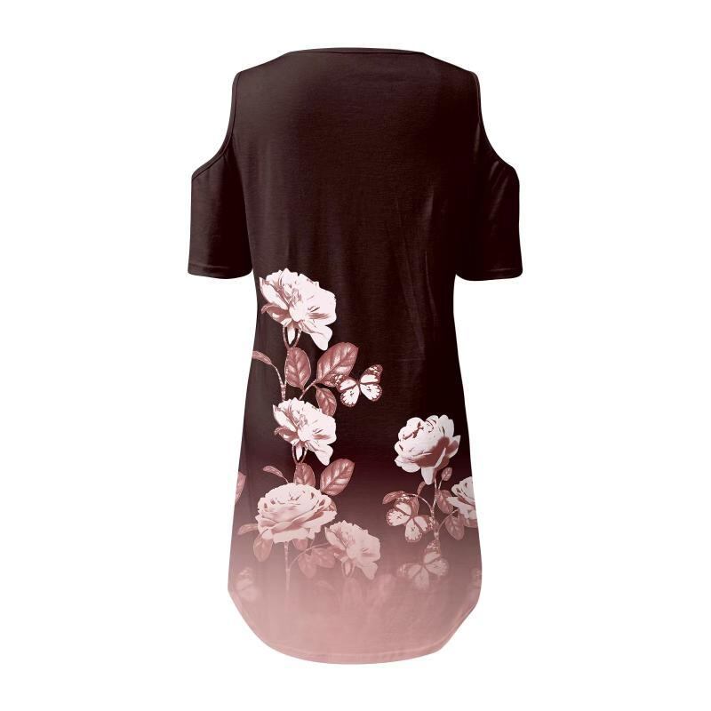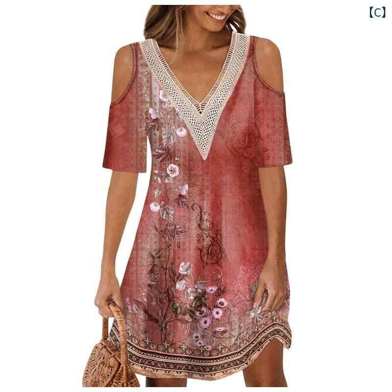ワンピース レディース 半袖 Vネック オフショルダー 花柄プリント フリル襟 ハイウエスト Aライン ミディ丈 ポリエステル素材 ストリートスタイル