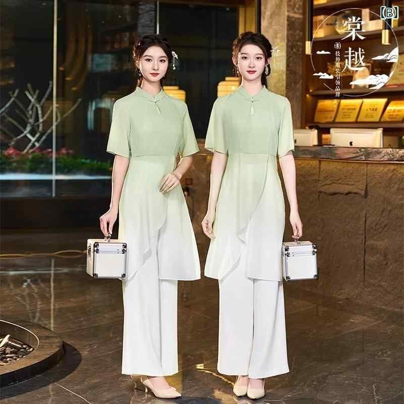 ユニフォーム セットアップ レディース 中華風 高級感 美容師 エステ セラピスト サロン フットケア リラクゼーション スパ 帯電防止 Vネック 五分袖 ロングパンツ 綿ポリ素材 通年