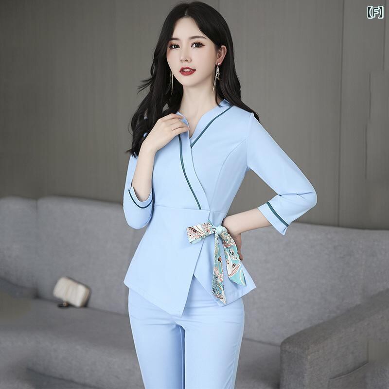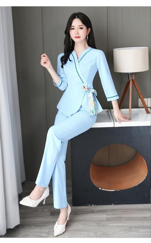 ワークユニフォーム レディース 美容室 エステ サロン フットケア マッサージ 施術着 スリム 細見え 吸湿速乾 ポリエステル 半袖 七分袖 セットアップ ピンク スカイブルー ライトグリーン ネイビー