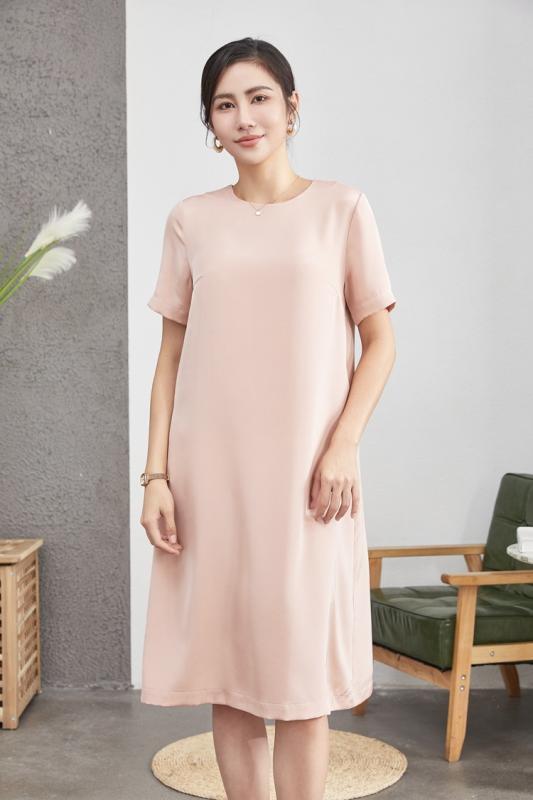ワンピース レディース シルク 絹 夏服 大きいサイズ ゆったり 膝丈 ミモレ丈 新中華風 チャイナ風 半袖 Aライン ラウンドネック 無地 エレガント 上品 通勤 オフィスカジュアル