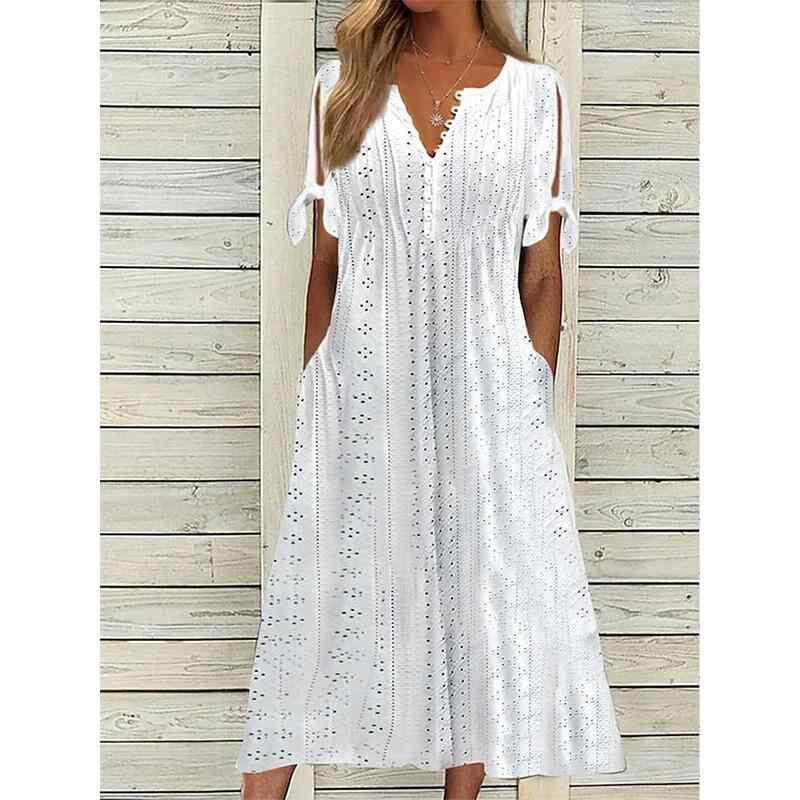 ワンピース レディース 女性用 Vネック レース 透かしデザイン 半袖 フリル ハイウエスト ミディ丈 フレア 無地 ポリエステル 通勤 きれいめ ポケット付き