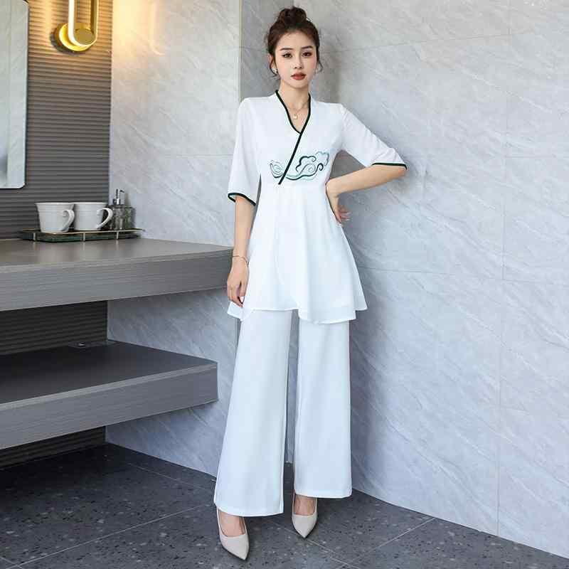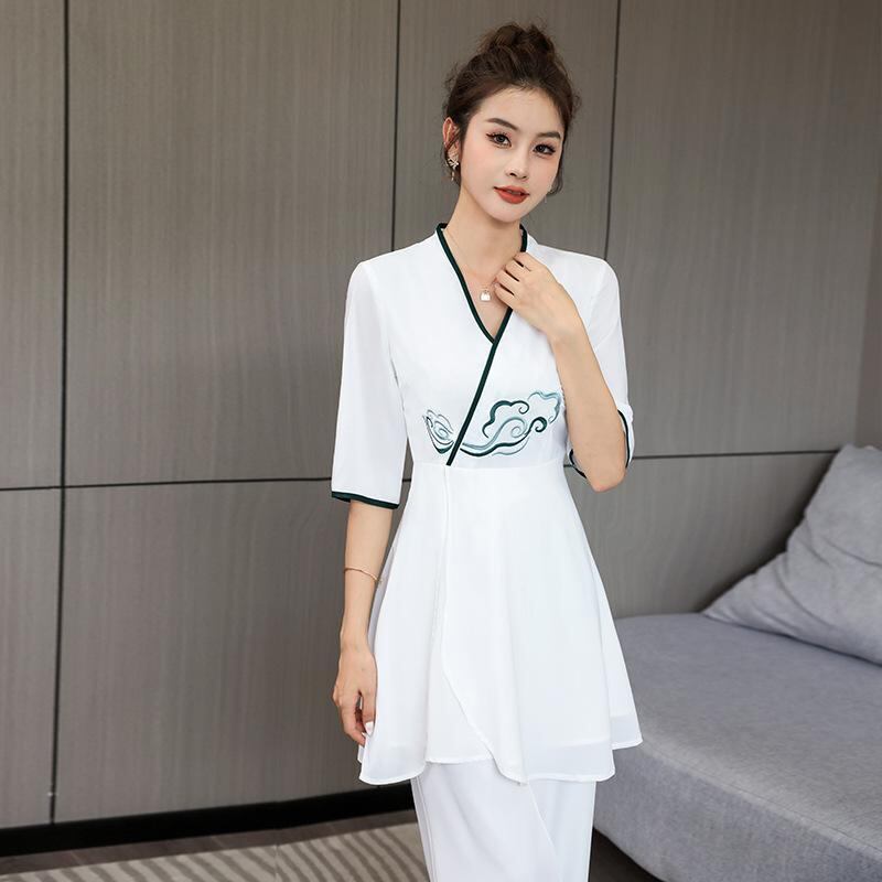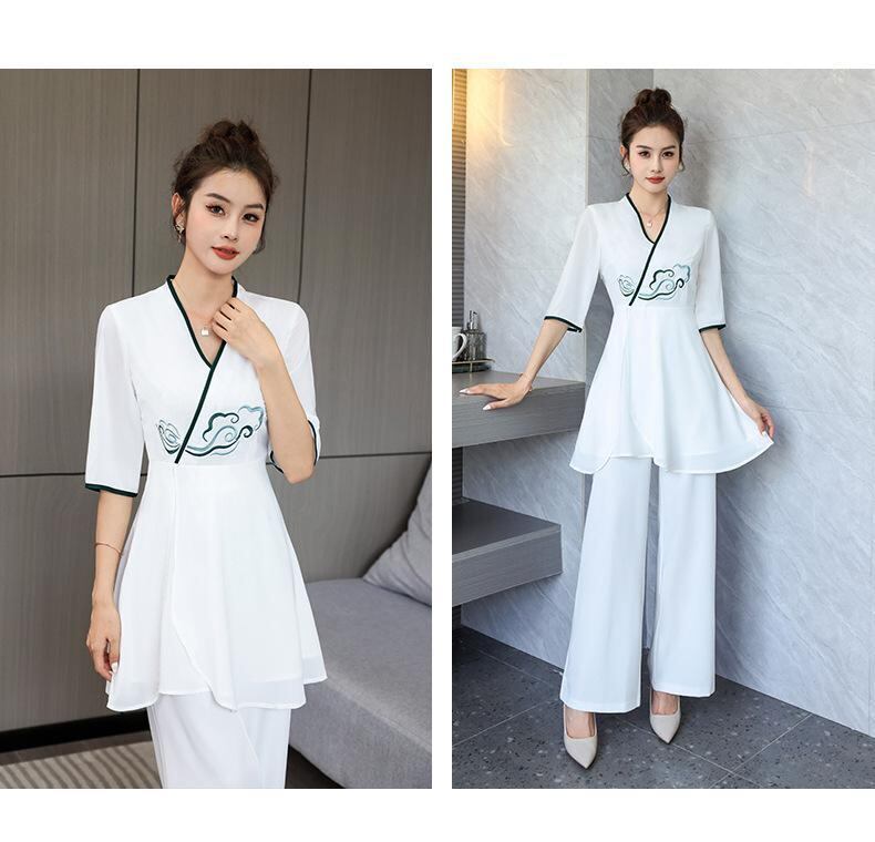 ユニフォーム レディース 美容師 エステ スパ サロン 施術着 作業服 セットアップ オリエンタルデザイン 高級感 上品 Vネック 五分袖 ロングパンツ 吸湿速乾 ポリエステル ホワイト