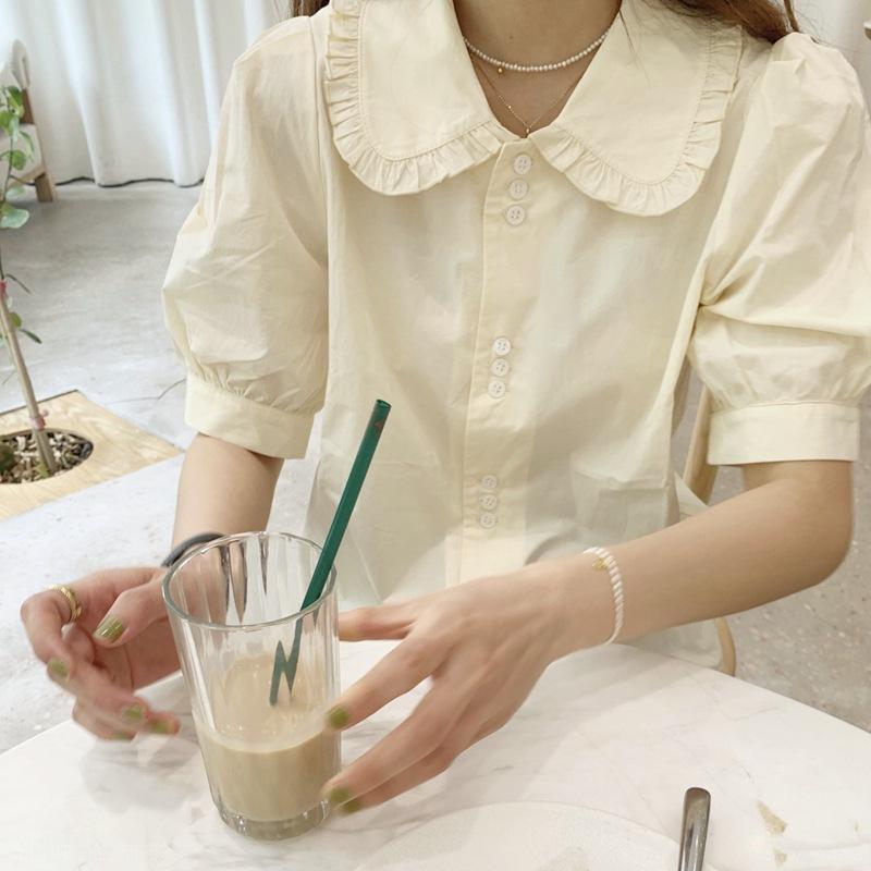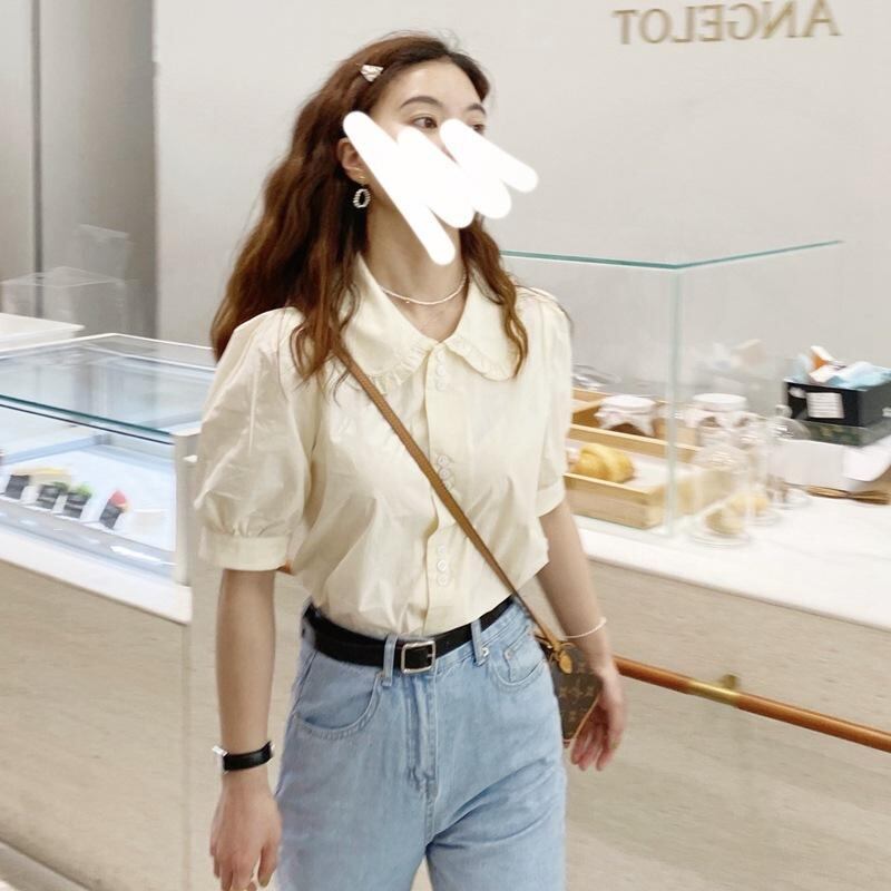 ブラウス レディース 淡奶油色 泡泡袖 直角肩 娃娃领 短袖 衬衫 薄款 宽松型 纯色 纽扣 港风 文艺复古 甜美清新