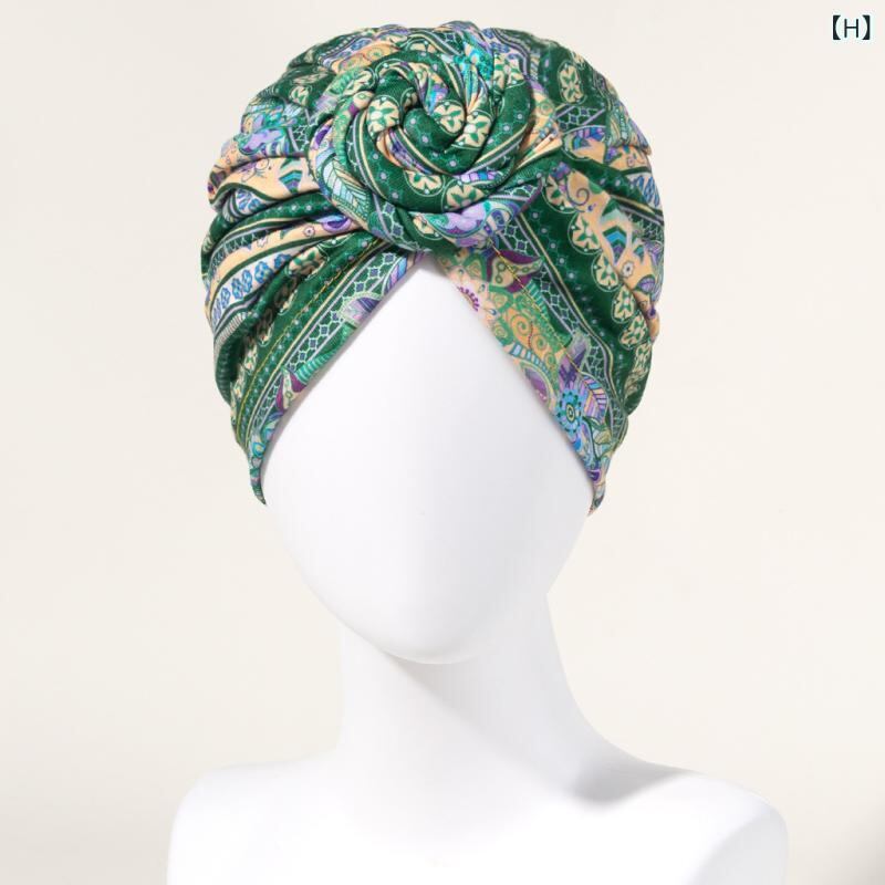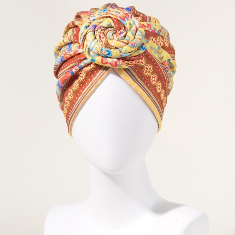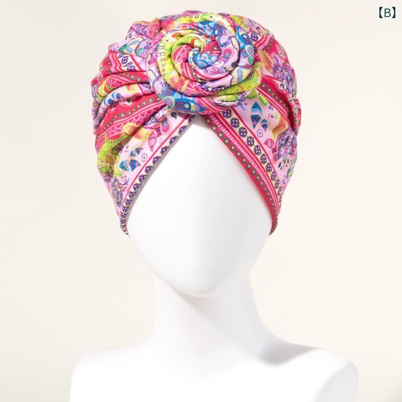 ターバン レディース 大人用 ミセス ドーナツ型 ポンポン付き 渦巻きデザイン 花柄 プリーツ ギャザー 民族風 インド風 ヘッドスカーフ ポリエステル サテン織り ファッション小物 オールシーズン
