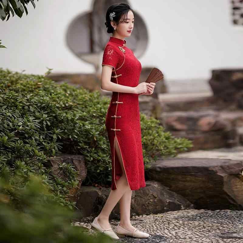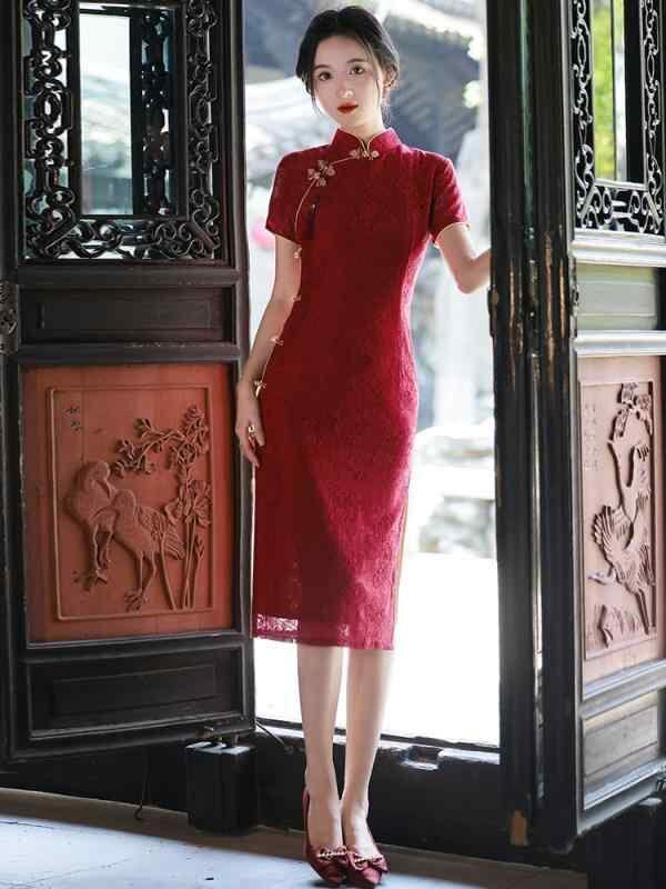 チャイナドレス レディース ワインレッド 高級感 エレガント 改良版 結婚式 披露宴 二次会 お呼ばれ パーティー フォーマル ブライダル ロング丈 秋物 ラウンドネック 7分袖 ポリエステル