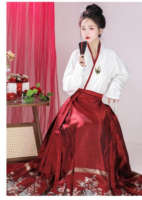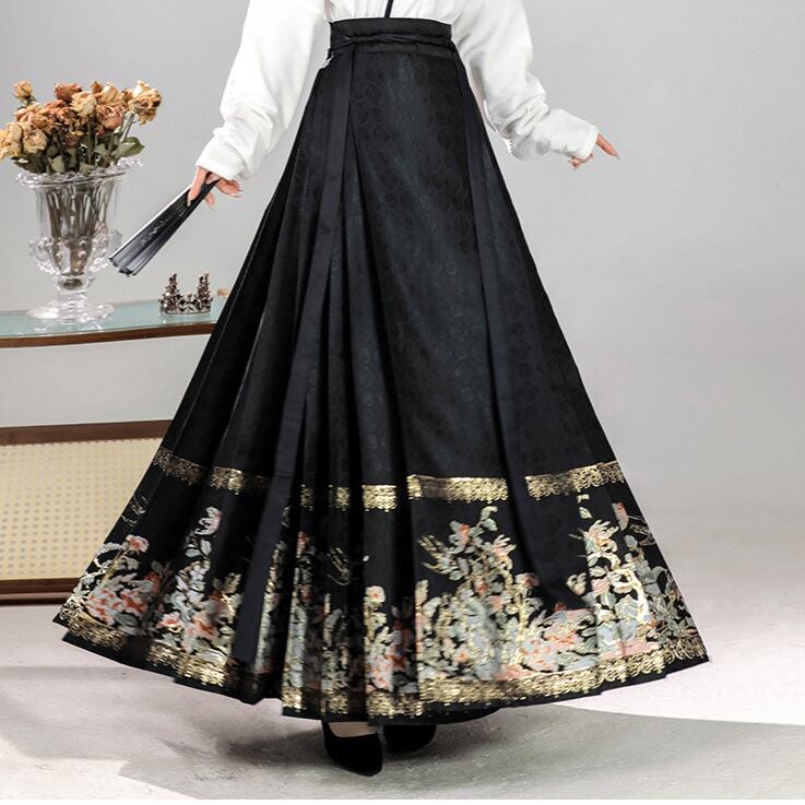 スカート 漢服 改良型 マメンスカート 伝統衣装 フェイク錦織 織り柄 吉祥柄 学生 デイリーユース 日常使い 通学 通勤 カジュアル レッド ブラック プリーツスカート