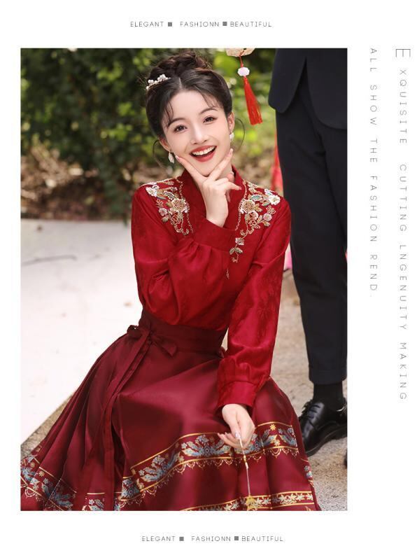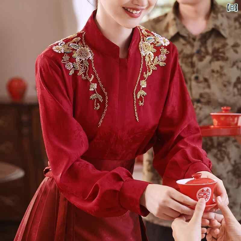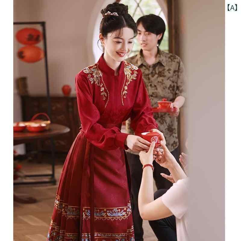 ドレス 花嫁 ウェディング ブライダル 漢服 馬面スカート 新中華風 モダンチャイニーズ 赤 レッド 長袖 ロングスリーブ 高級感 披露宴 お色直し 二次会 結納 婚約式 結婚式 春用 | cybercart