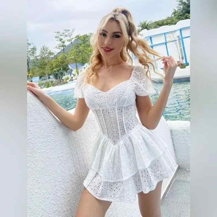 ワンピース レディース エレガント スクエアネック パフスリーブ 半袖 ウエストマーク レース 2段ティアード 綿 コットン ポリエステル 無地 ホワイト ブラック
