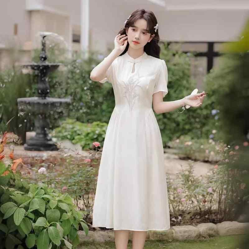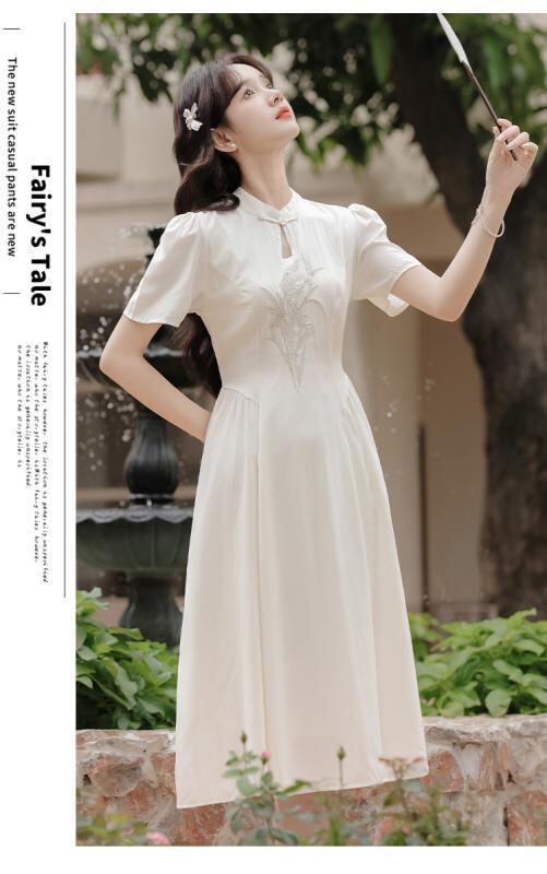 ワンピース レディース 新チャイナ風 中華風 上品 エレガント 大人かわいい ミディ丈 半袖 パフスリーブ 旗袍襟 ティアードフリル 体型カバー シフォン コットン グリーン アプリコット